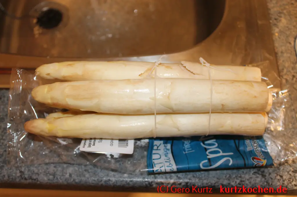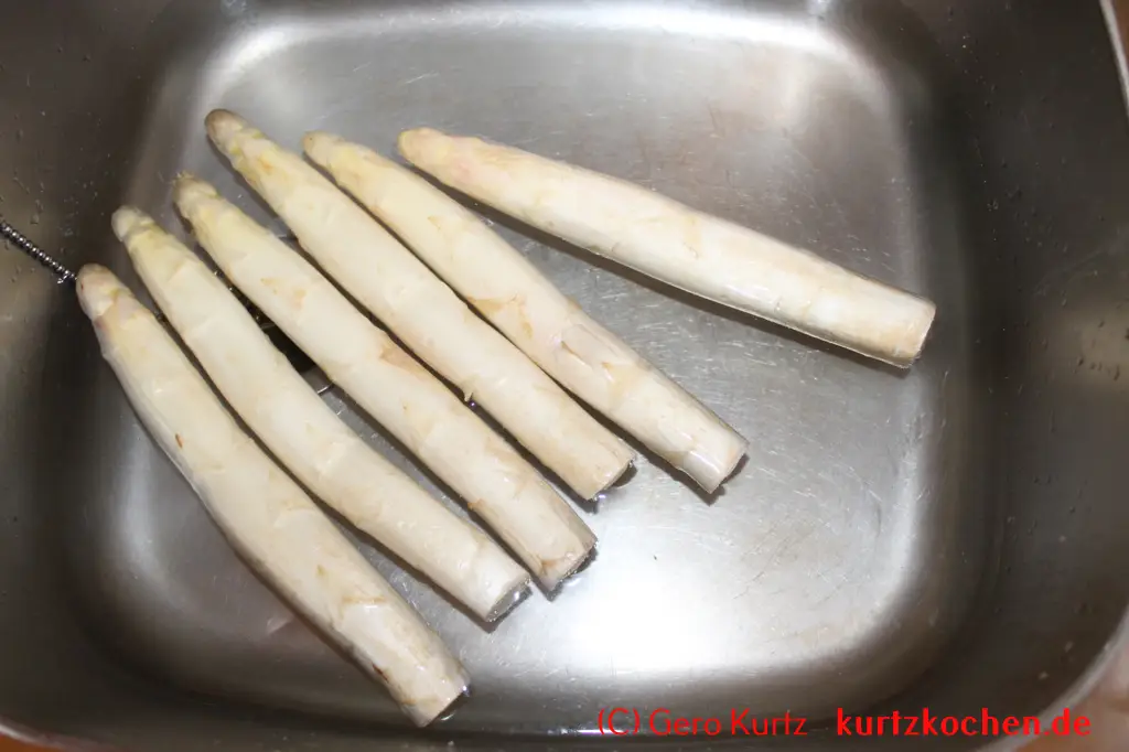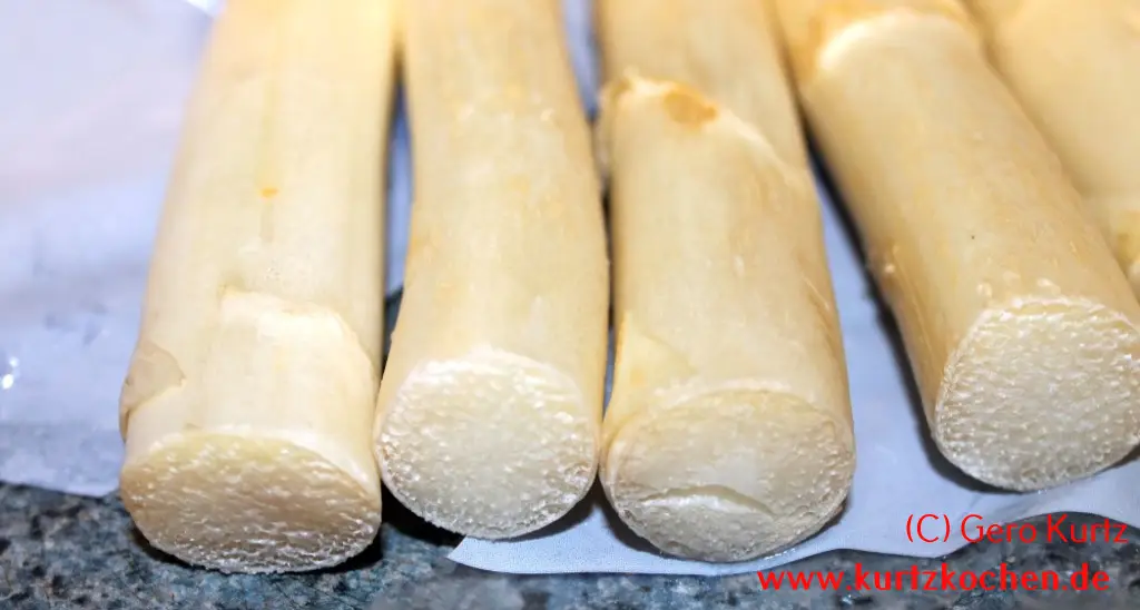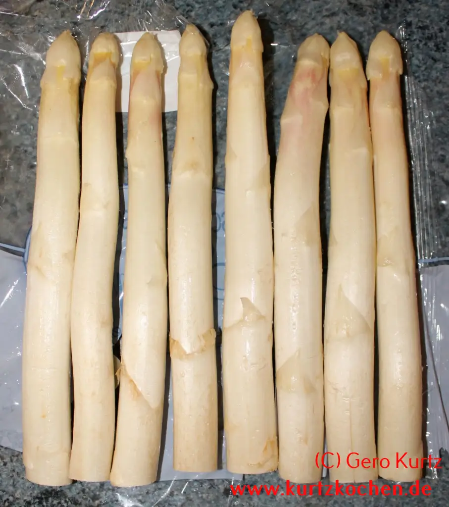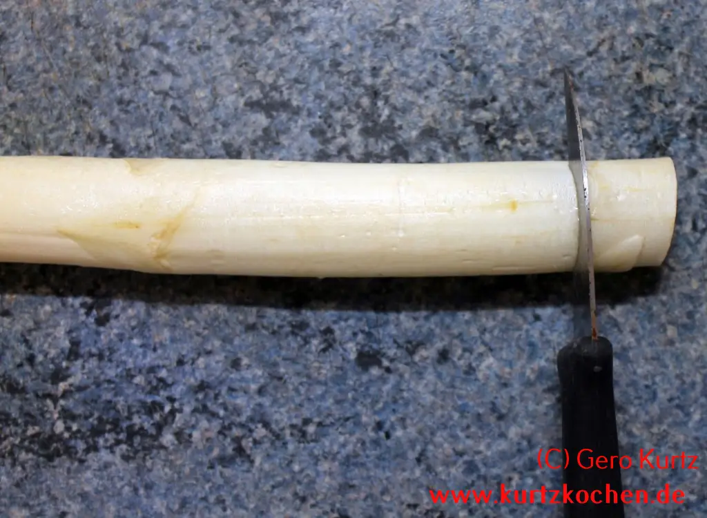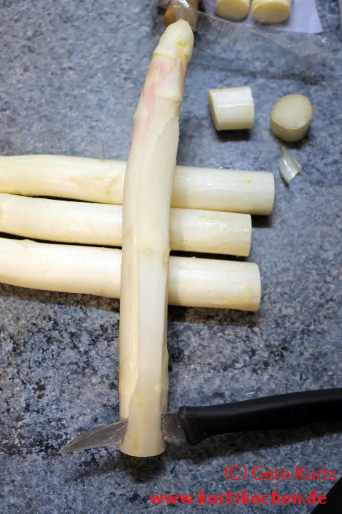 Zuerst müssen die Spargel gewaschen werden. Danach wird das Stielende ca. 2 cm abgeschnitten. Bei sehr holzigem Spargel muss bis zu einem Drittel unten abgeschnitten werden. Dann den Spargel schälen. Das muss sein, da die äußeren Teile des Spargels, vor allem in den unteren Bereichen, faserig sind, was auch beim Kochen nicht weich wird. Die Spitze bleibt unberührt. Den Spargel in die Hand nehmen und mit dem scharfen Gemüsemesser vorsichtig von oben nach unten dünne Streifen rundherum abschneiden. Wer es nicht schafft, mit dem Messer dünne Streifen zu schneiden, kann auch den Sparschäler verwenden. Zum Schluss zur Kontrolle ein Stück Spargel unten abschneiden (darf keine Fäden ziehen) und essen. Schmeckt alles wie ein schöner roher Kohlrabi, dann ist es ok, falls es Ihnen im Halse stecken bleibt, dann muss weiter geschält werden bzw. mehr unten abgeschnitten werden.