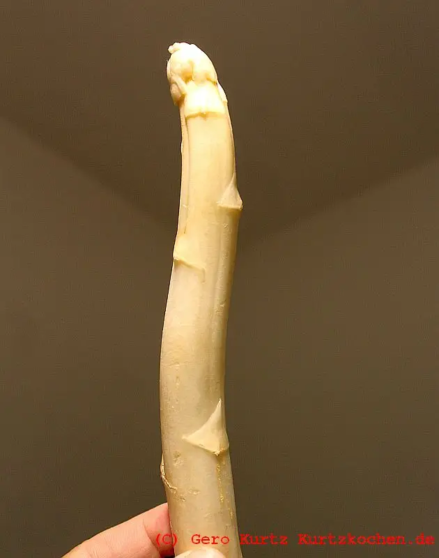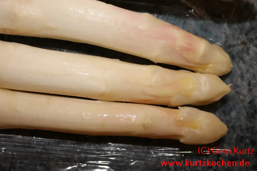 Es kann vorkommen, dass man versehentlich Spargel kauft, welcher nicht mehr frisch genug ist, oder den man selbst zu Hause zu lange gelagert hat. Wenn er nicht gerade schon gammelig ist, sondern nur etwas ausgetrocknet, dann hilft es ihn etwa eine Stunde vor dem Schälen in kaltes Wasser zu legen. Der Spargel nimmt die Feuchtigkeit auf, und kann dann wie gewohnt geschält werden.