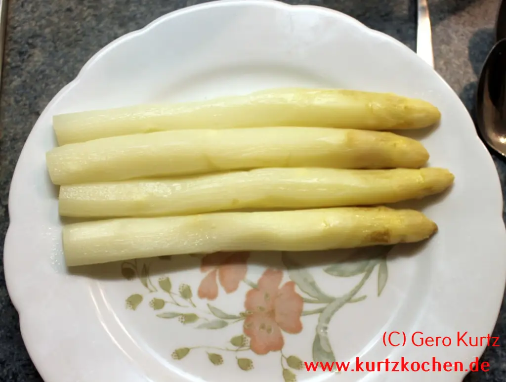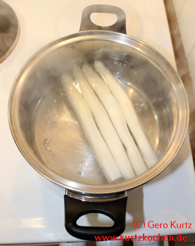 Füllen Sie jetzt den Kochtopf mit Wasser und geben Sie etwas Salz hinzu, sodass das Wasser leicht salzig schmeckt (in etwa wie die Ostsee). Das Wasser zum Kochen bringen (sprudelnd) und die Spargel hineinlegen. Nun starten wir die Stoppuhr. Der Spargel benötigt ca. 15 bis 20 Minuten, um weich zu werden. Tipp: Ein Stück Butter dem Kochwasser hinzugeben. Bei griechischem Spargel auch etwas Zucker.