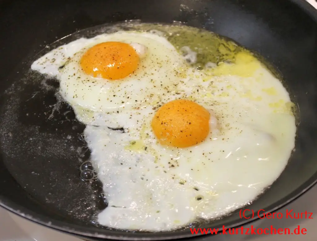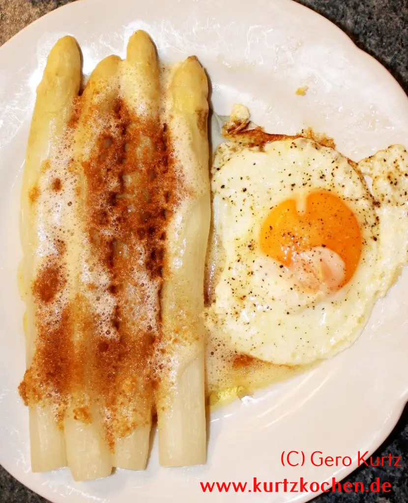 Zu dem Spargel passen sehr gut gebratene Eier und noch besser schmeckt es, wenn Sie zu der braunen Butter noch einige Scheiben Bacon braten und oben darauf geben. Kartoffeln runden das Spargelgericht ab.