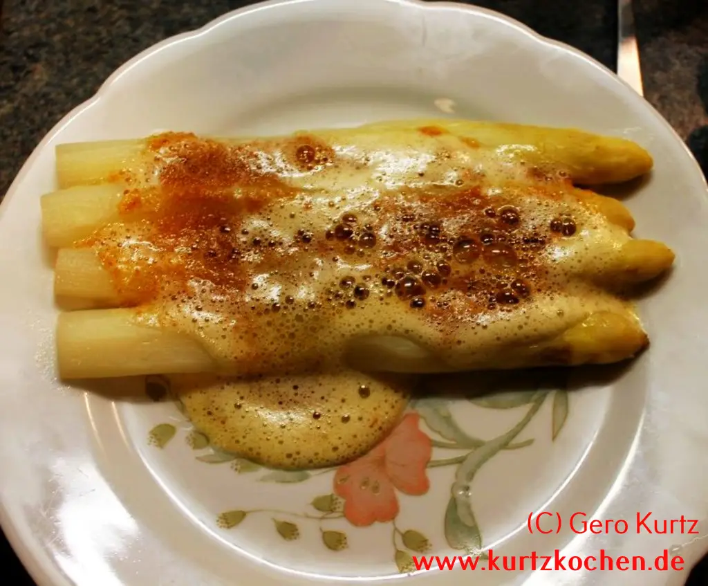 Eine andere klassische Zubereitungsmöglichkeit ist den Spargel mit einer Holländischen Soße (Sauce Hollandaise).