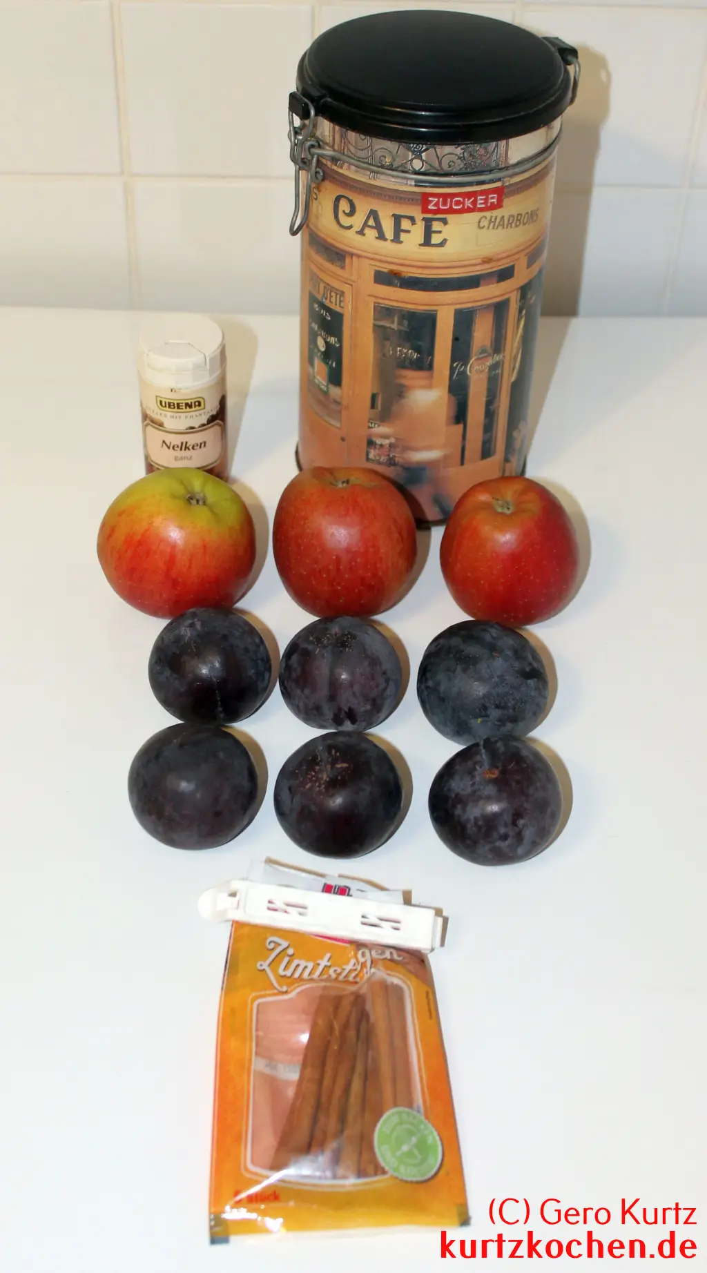 Für ein leckeres Apfel-Pflaumen-Kompott benötigen wir natürlich Äpfel und Pflaumen. Besonders gut eignen sich dafür auch Falläpfel. Diese fallen meist schon früher vom Baum, weil sie kleine Schäden aufweisen, wie angestoßen oder madig. Oder aber sie sind einfach reif und fallen deshalb. Also haben sie alle einen kleinen Schaden, entweder vor dem Fall oder durch den Aufprall beim Fallen und eignen sich nicht als Lagerapfel, da sie recht schnell faulen. Sie müssen also weg und man kann daraus gut Kompott kochen. Äpfel nur alleine schmecken nicht so gut, aber in Verbindung mit Pflaumen wird daraus eine Köstlichkeit, welche von keinem Kind verschmäht wird.