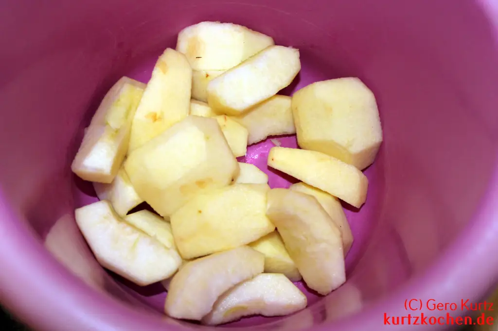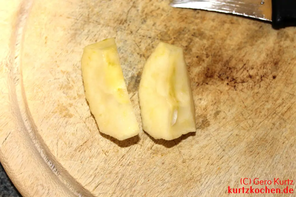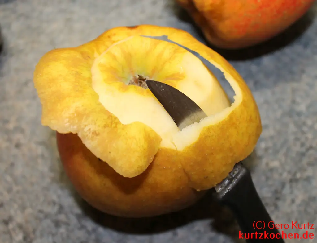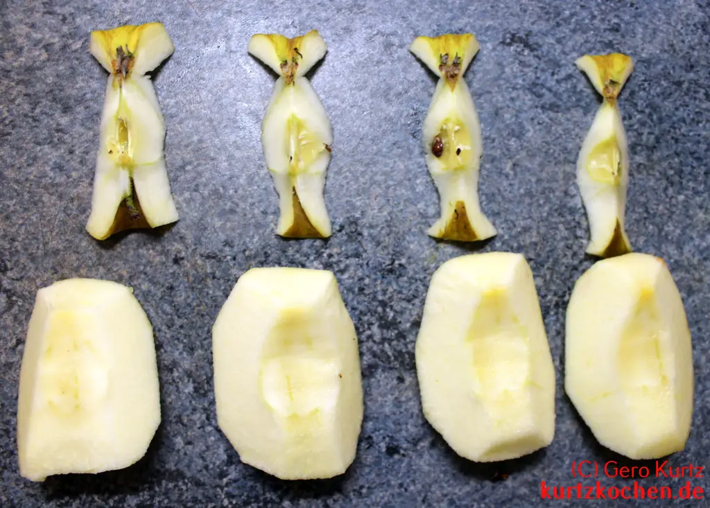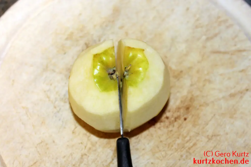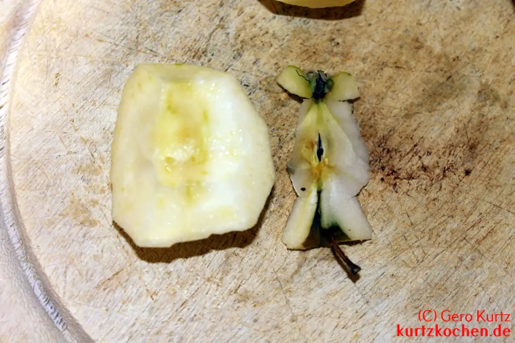 Achte darauf, dass wirklich alles abgetrennt wurde. Teile der Blüte sehen später unschön im Kompott aus und Teile des Kerngehäuses sind hart und werden auch beim Kochen nicht weich.
