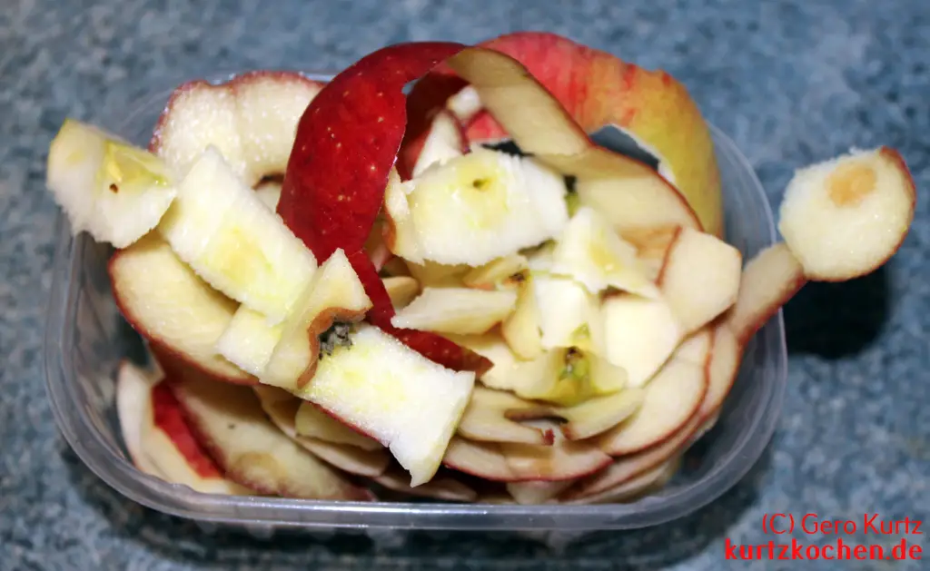 Zuerst nehmen wir die Äpfel und schälen diese ringsherum mit einem Küchenmesser. Man fängt oben an und schält spiralförmig in Richtung Stiel.