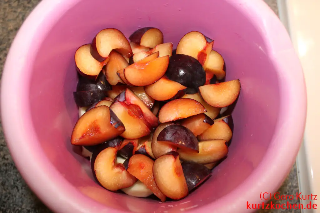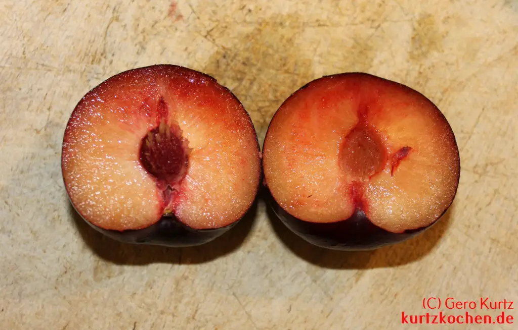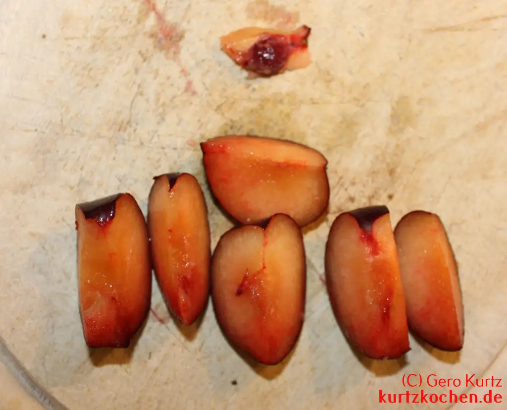 Nun teilen wir nochmals die Pflaumenhälfte und schneiden dabei gleich den Kern heraus. Bei den Pflaumen ist zu beachten, dass es ja mehrere Arten von Pflaumen und Reifezustände gibt. Ist die Pflaume reif, dann kann man diese Arbeiten normalerweise mit der Hand erledigen. Leider werden die meisten Pflaumen im Supermarkt aber sehr unreif verkauft, so dass man zum Messer greifen muss. Bei den Pflaumen unbedingt auf Schimmel achten. Wenn solcher zu sehen ist, die Pflaume nicht mehr verwenden und sofort entfernen.