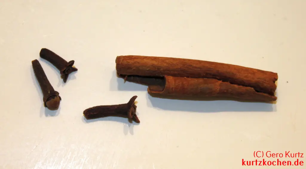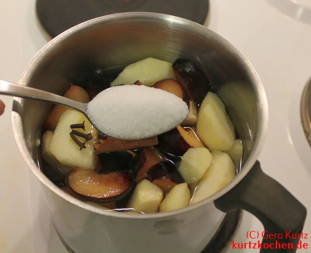 In den Kochtopf noch die entsprechenden Zutaten geben. Das wären die zwei Nelken, das Stück Zimt und etwa zwei bis drei Esslöffel Zucker. Steht kein Stangenzimt zur Verfügung, dann geht auch gemahlener Zimt. Der Zucker ist Geschmacksache und hängt auch sehr vom Zuckergehalt der Pflaumen und Äpfel ab. Ich rate dazu, erst einmal weniger zu zuckern und später nach Wunsch nachzuzuckern, wenn das Kompott fast fertig ist.