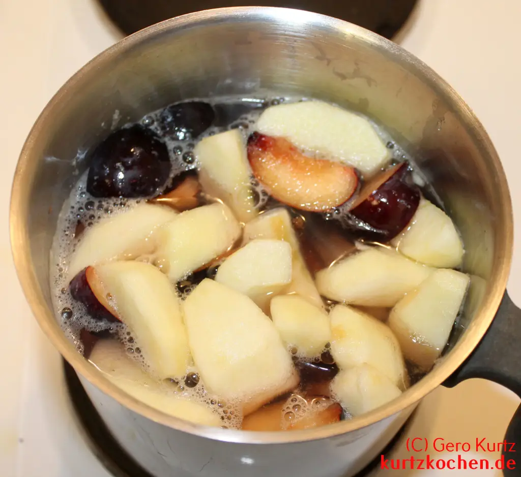 Dann das Kompott sprudelnd aufkochen lassen und auf kleinerer Flamme weiterköcheln lassen. Gelegentlich umrühren. So lange kochen lassen, bis die Äpfel und Pflaumen ausreichend weich sind. Danach mit einem Löffel das Kompott kosten und gegebenenfalls noch nachsüßen.