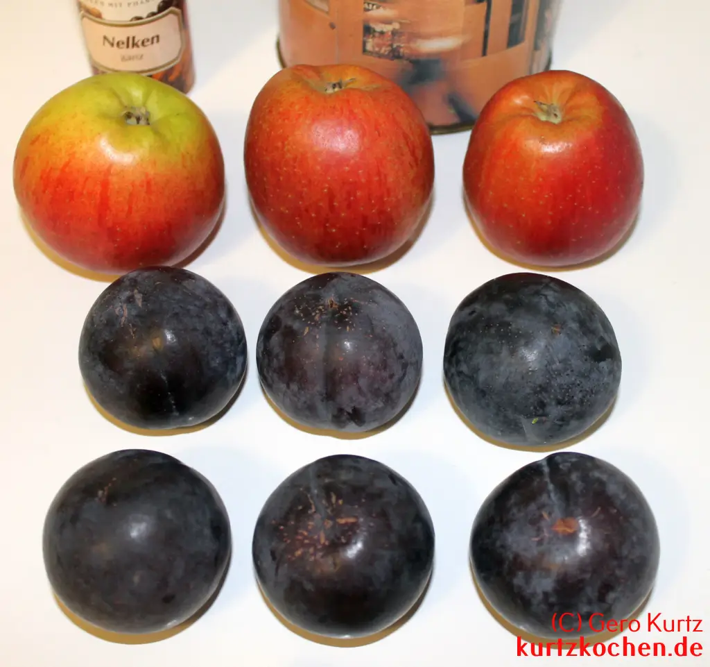 Wir benötigen also einige Äpfel und einige Pflaumen, etwa zu gleichen Teilen. Dabei dürfen die Äpfel auch Falläpfel sein oder auch leicht wurmstichig.