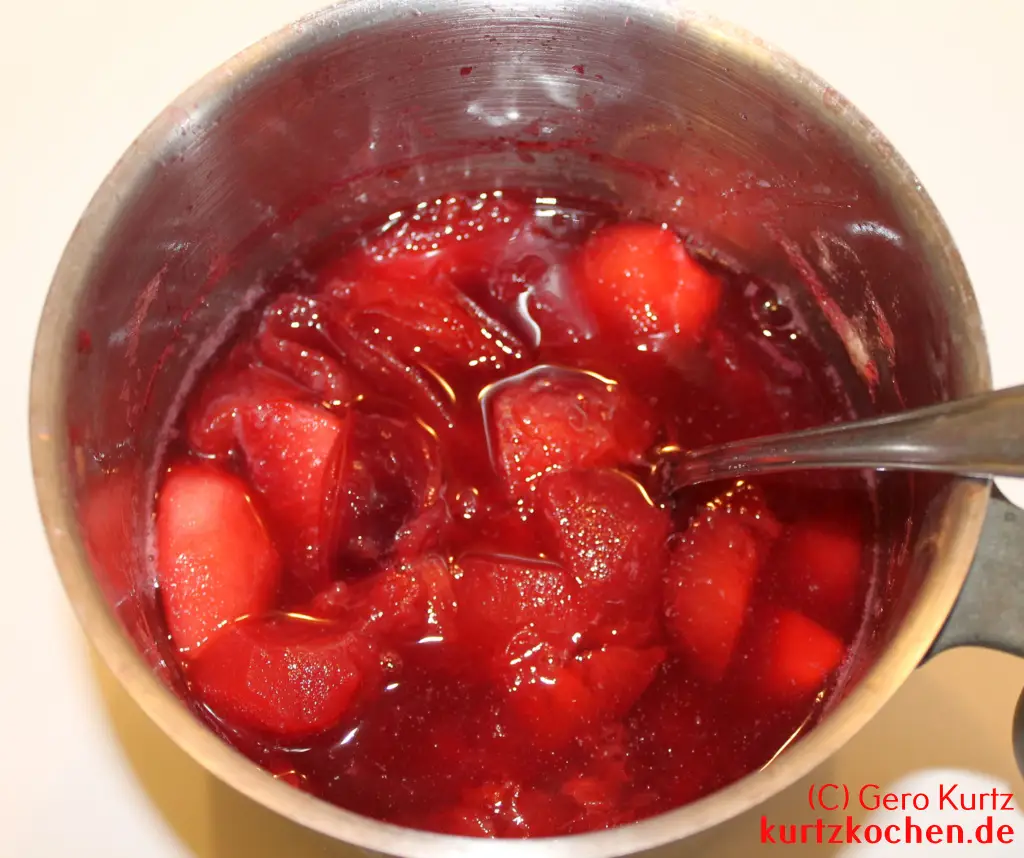 Wasser hinzugeben, sodass die Fruchtstücke gerade noch herausschauen. Nicht zu viel Wasser nehmen, sonst schmeckt das Kompott später wässrig.
