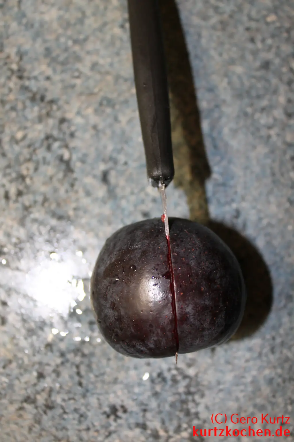 Mit dem Küchenmesser schneiden wir die Pflaume rundherum auf und nehmen sie auseinander.