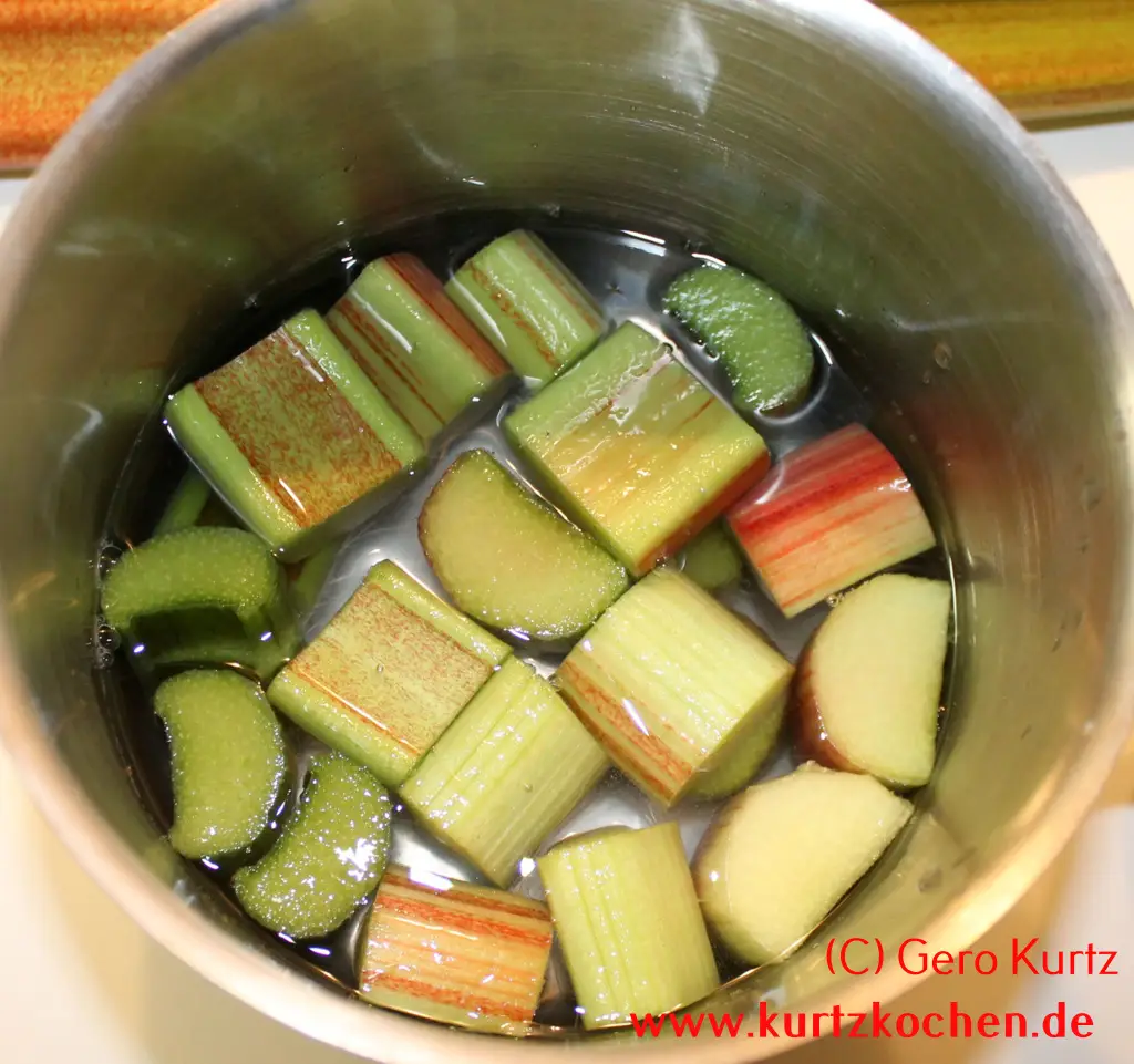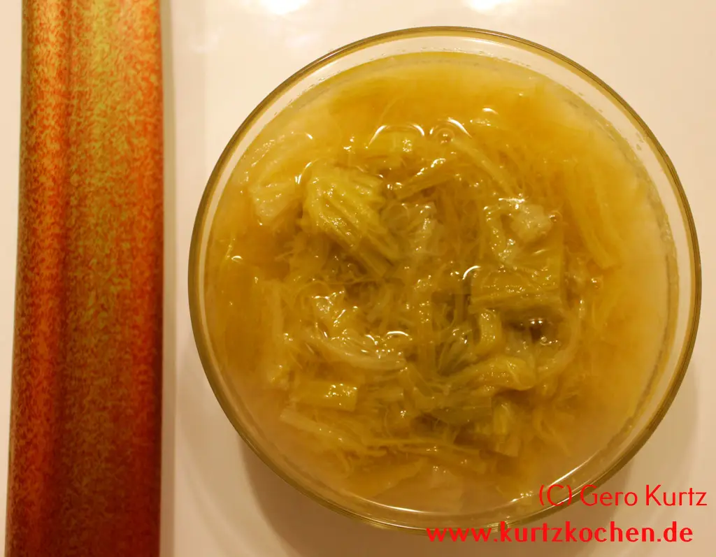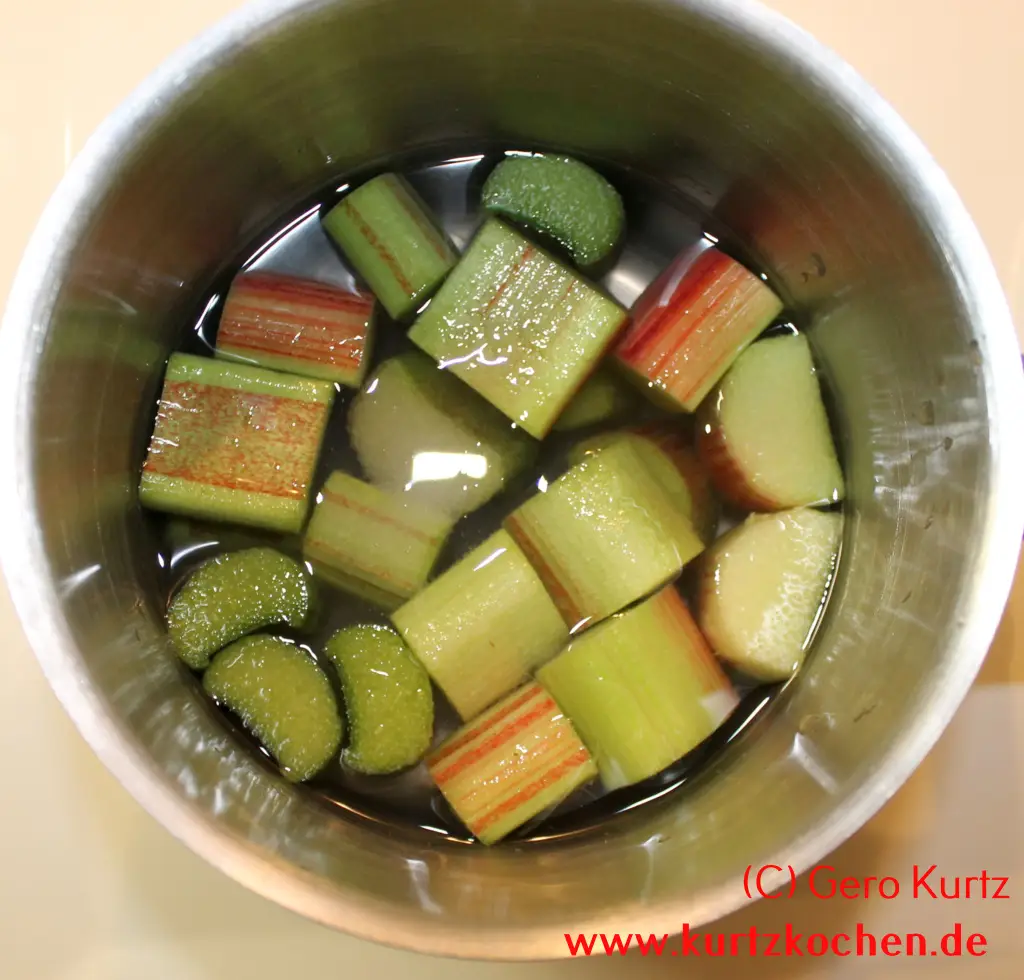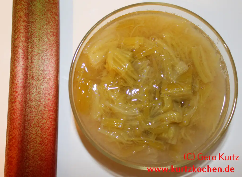 Anmerkung: Ein festes Rezept für Rhabarberkompott zu schreiben, ist nicht so ganz einfach. Der Rhabarber unterscheidet sich sehr stark hinsichtlich der Säure und des Geschmacks entsprechend der Sorte, dem Zeitpunkt der Ernte und dem Standort plus den Wuchsbedingungen. Bei sehr jungem und rotem Rhabarber benötigen sie nur wenig Wasser und auch nur wenig Zucker. Bei im Juni geerntetem grünem Rhabarber benötigen Sie mehr Wasser und Zucker, da er zu diesem Zeitpunkt schon sehr sauer ist. Probiere es einfach aus.