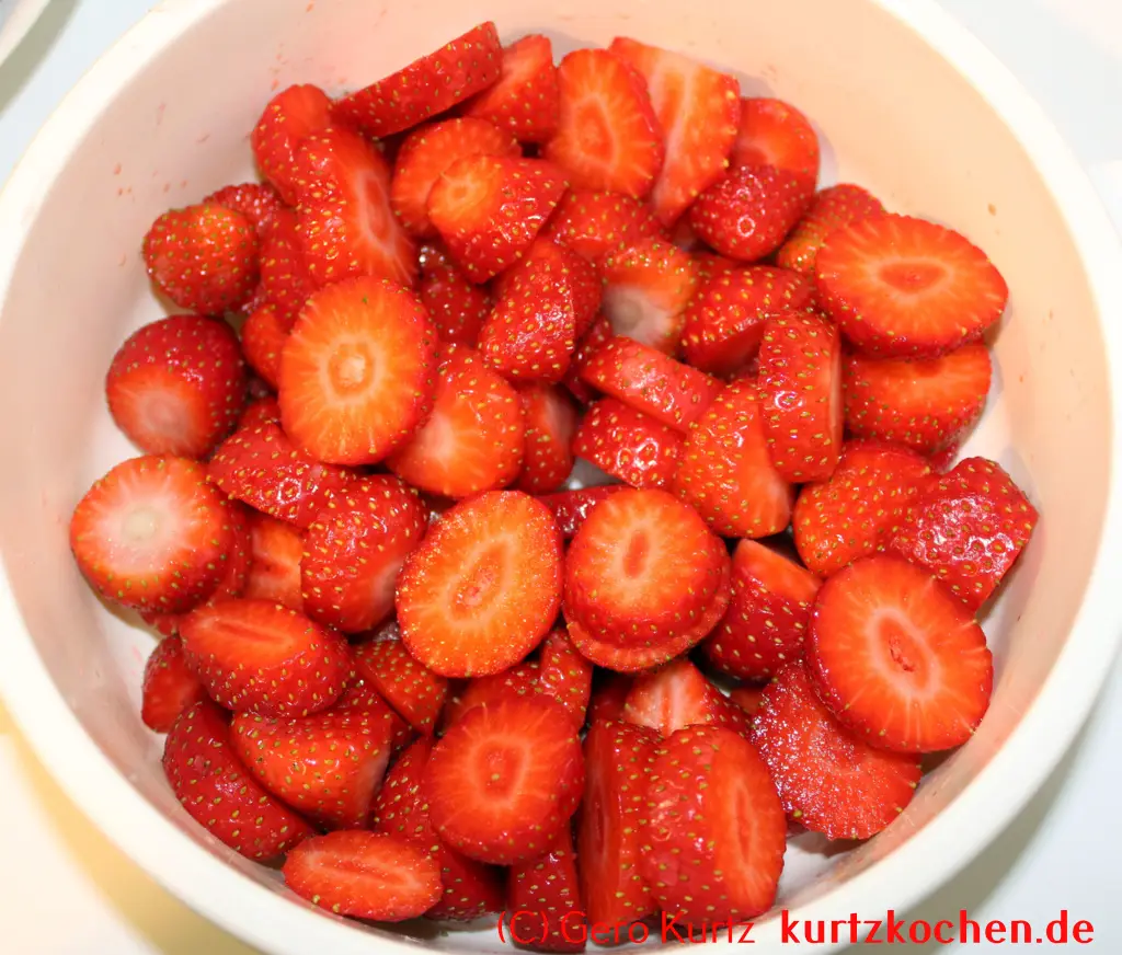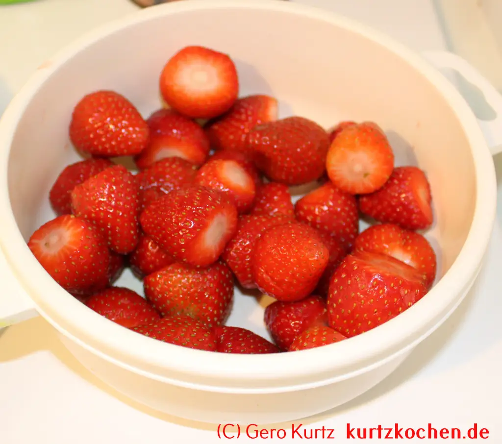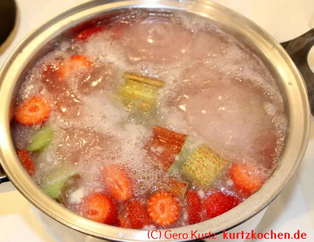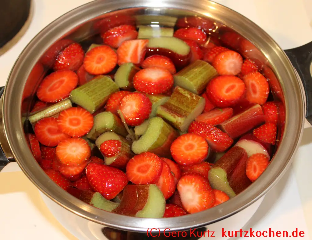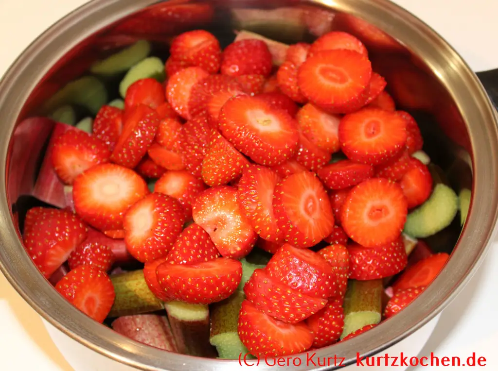 Den Rhabarber in kleine Stücke schneiden und in den Topf geben. Die Erdbeeren gut waschen, in kleine Stücke schneiden und ebenfalls in den Topf geben. Beim Zucker muss man das später abschmecken. Gib erst einmal vor dem Kochen zwei gehäufte Esslöffel dazu. Wie viel Du später noch benötigst, hängt vom Säuregehalt des Rhabarbers und der Süße der Erdbeeren ab.