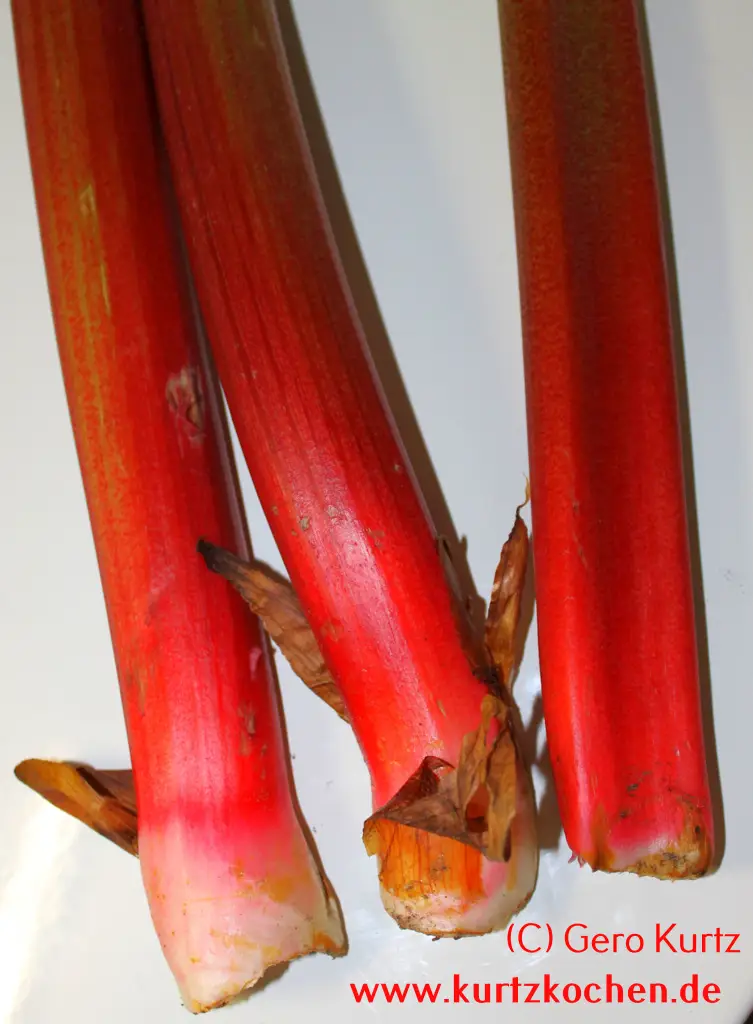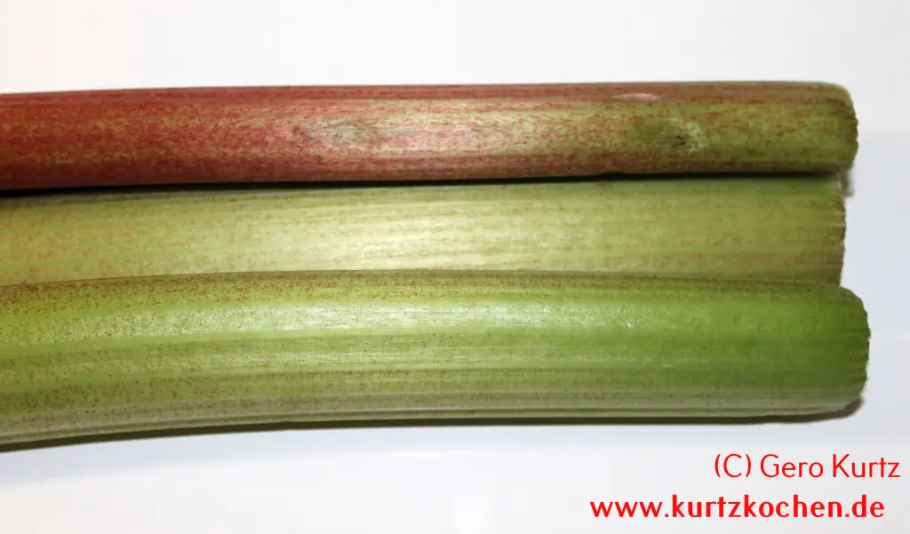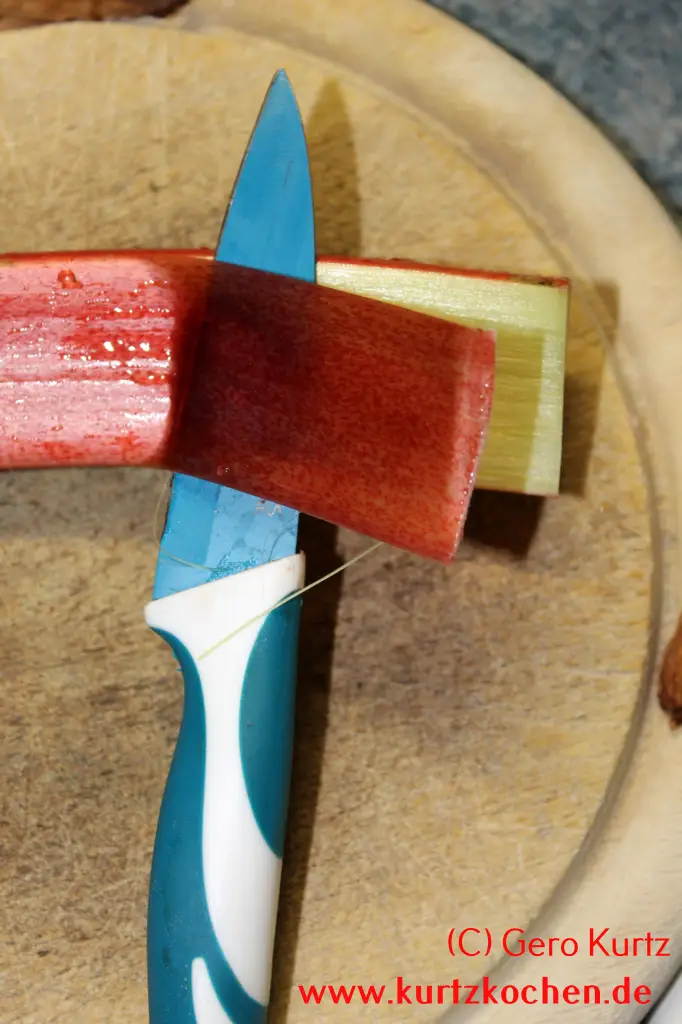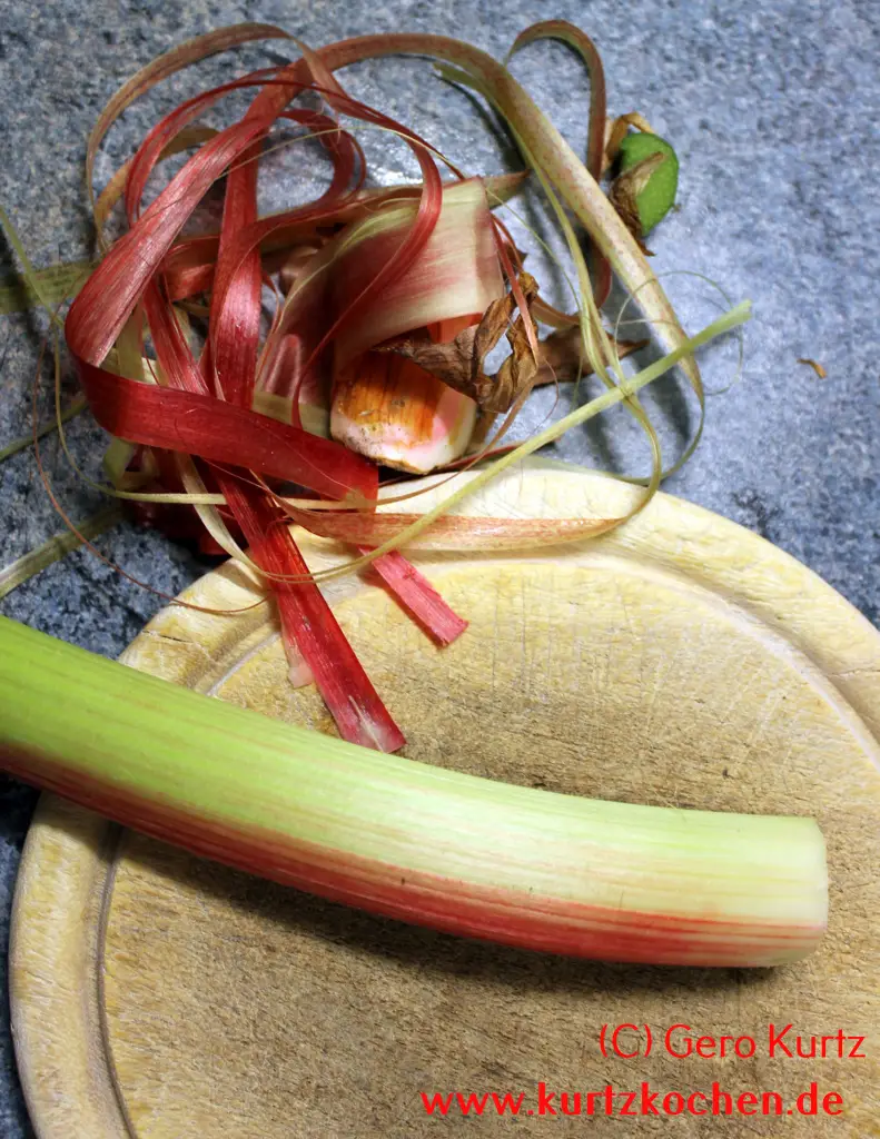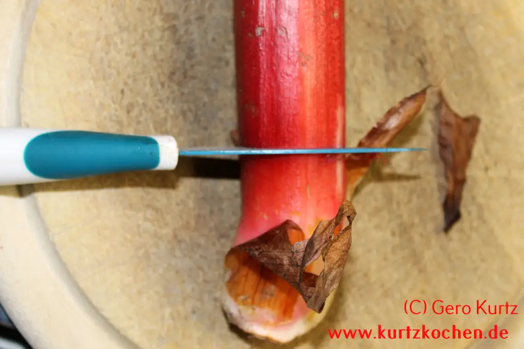 Nun schneiden unten von den Stielen den weißen Bereich ab, wo der Rhabarber mit der Pflanze verbunden war. Danach wasche die Stängel gründlich. Nun nimm ein scharfes Messer und ziehe oben oder unten an der Schnittstelle beginnend die äußere Haut des Rhabarbers vorsichtig ab. Die Kunst dabei ist, nicht zu viel zu greifen, sondern wirklich nur die oberste Schicht. Bei ganz jungem Rhabarber ist dies normalerweise nicht notwendig. Je später der Stängel geerntet wird, desto härter und faseriger wird er. Du merkst das selbst, ob der Stängel noch harte Fasern hat oder nicht. Ist ähnlich wie beim Spargel. Es gibt auch Rhabarbersorten, wo das Abziehen nicht notwendig ist.