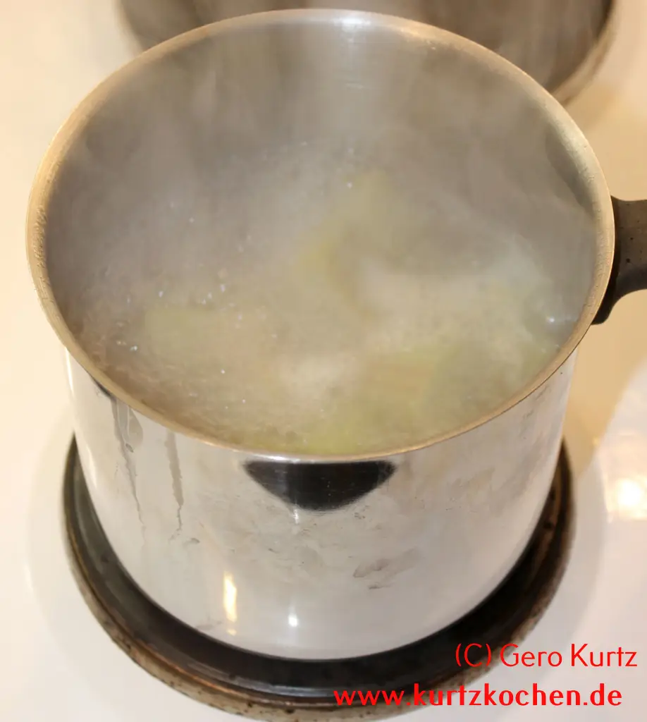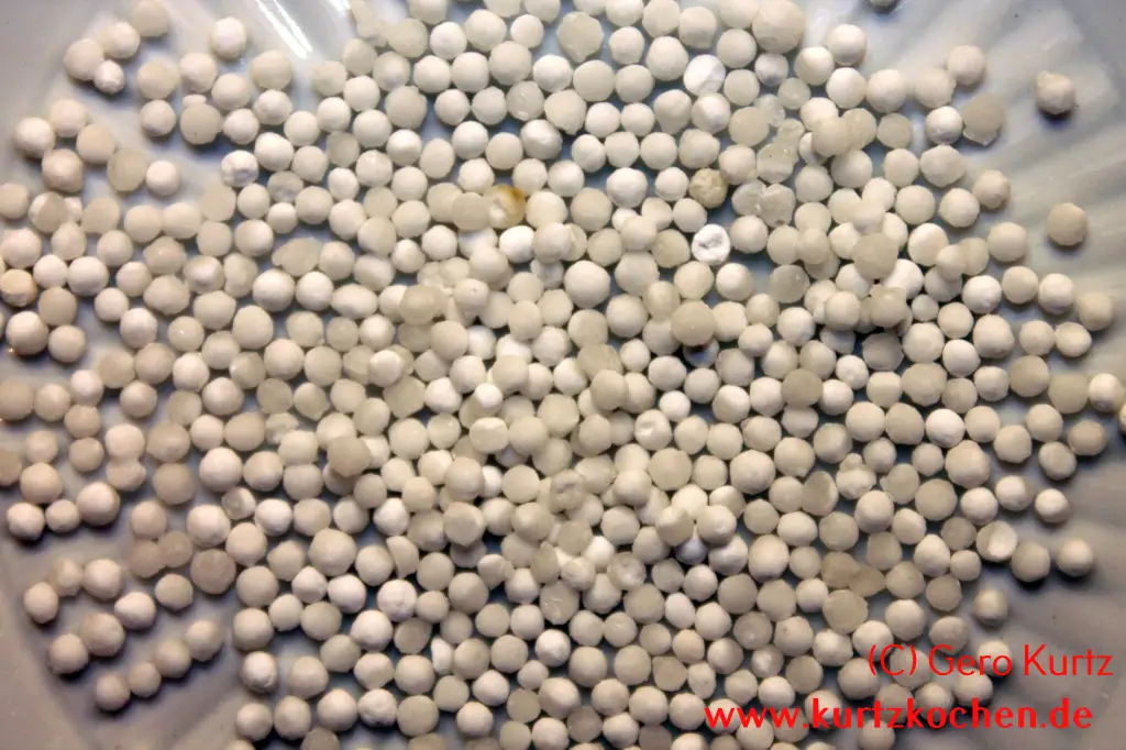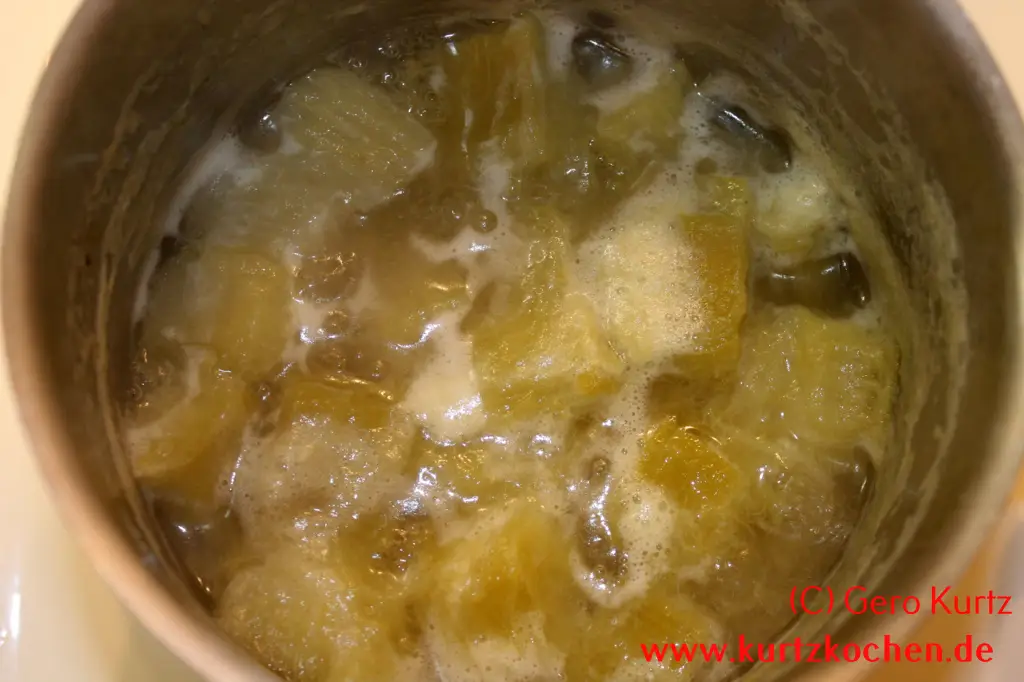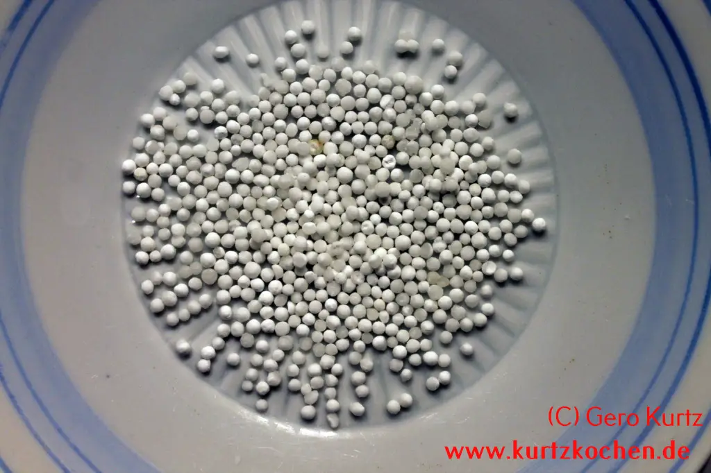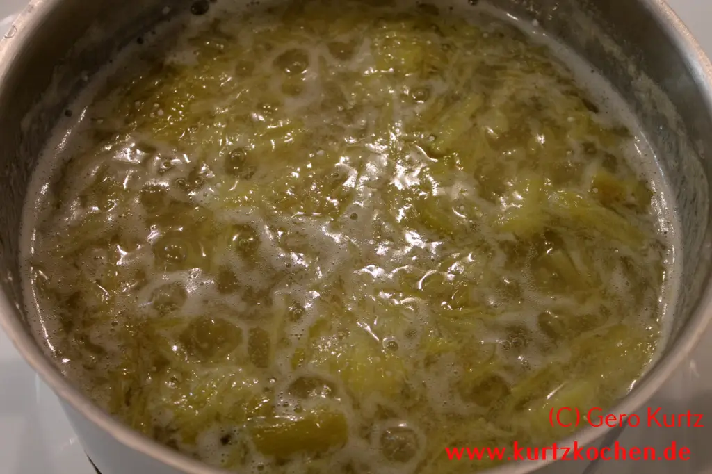 Die Vorgehensweise ist genau wie beim normalen Rhabarberkompott, nur dass jetzt noch der Perlsago direkt in den kochenden Rhabarber eingestreut wird. Das Ganze muss etwa 5 bis 15 Minuten leicht köcheln. Die Sagoperlen vergrößern sich nun. Die Perlsagokügelchen dürfen nicht verkochen und sollten noch rund sein. Den Topf vom Herd nehmen, wenn die Perlen aufgequollen sind und klar sind. Sie sehen dann aus wie Froscheier, daher im Volksmund diese Bezeichnung.