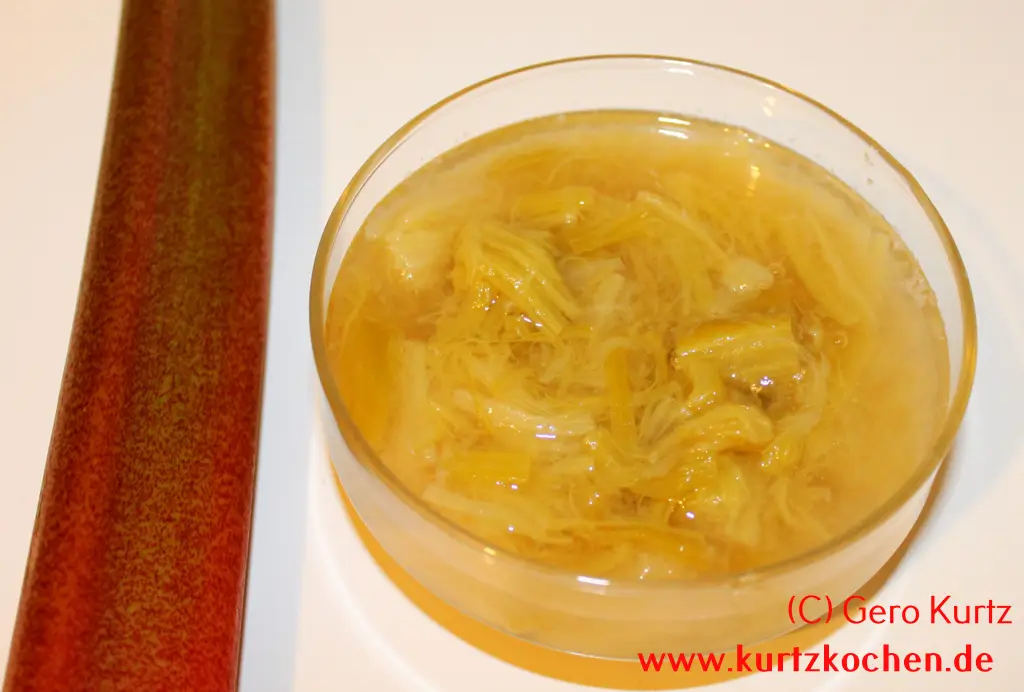 Nach dem Erkalten ist dann das Rhabarberkompott dickflüssig und man kann sehr gut dazu eine Vanillesoße kochen und dazu reichen. Die Vanillesoße bindet einen Teil der Oxalsäure und das Rhabarberkompott wird viel bekömmlicher.