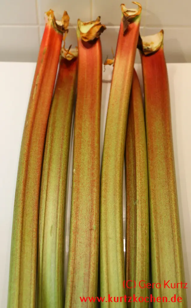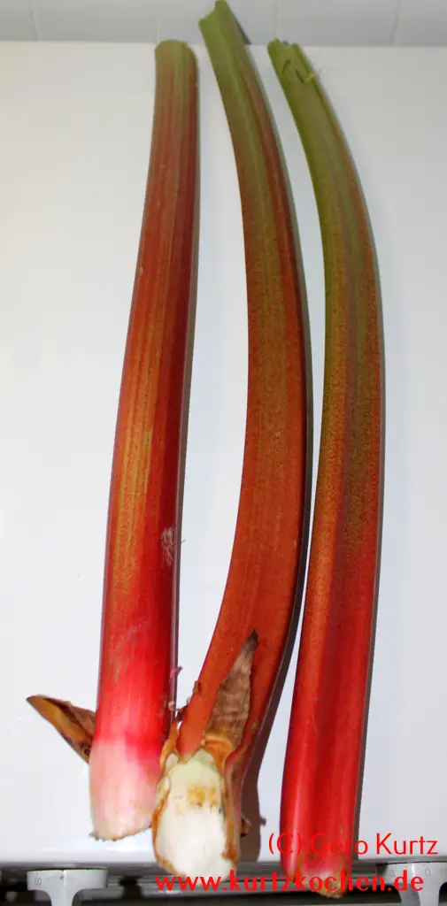 Wir benötigen zur Herstellung des Rhabarberkompotts zuerst natürlich den Rhabarber. Entweder frisch aus dem Garten oder aus dem Supermarkt bzw. vom Gemüsestand. Wenn Du ihn kaufst, achte bitte darauf, dass die Stängel noch nicht angegammelt sind, denn diese sind recht empfindlich.