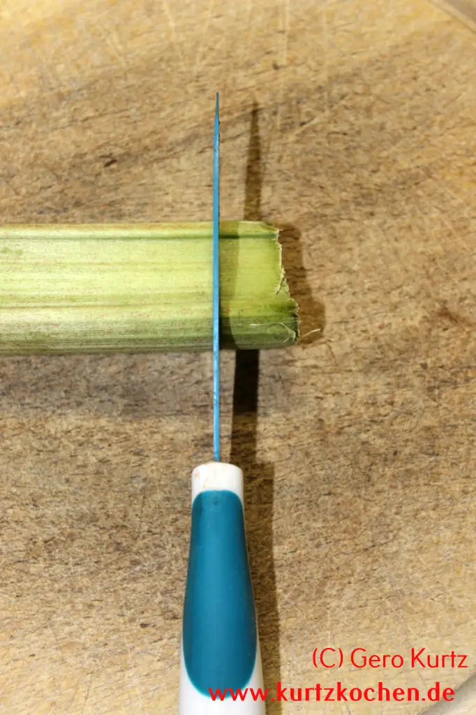 Die Blätter oben und den Stielansatz unten abschneiden. Die Stile waschen, abtrocknen und schälen. Schlechte Stellen entfernen. Die Stiele in 2 bis 3 cm große Stücken schneiden und in einen Gefrierbeutel legen. Diesen gut verschließen und in der Tiefkühltruhe lagern.