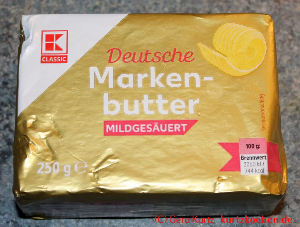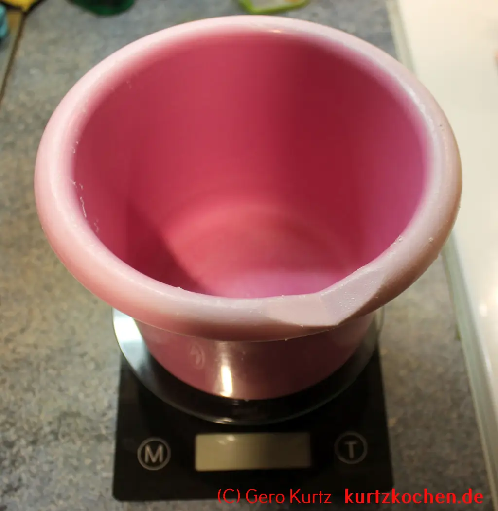 Die Butter bereits 1 bis 2 Stunden vor der Verarbeitung aus dem Kühlschrank nehmen und weich werden lassen. Dann eine Mixerschüssel nehmen und auf eine Waage stellen. Diese per Tara-Funktion auf Null stellen.