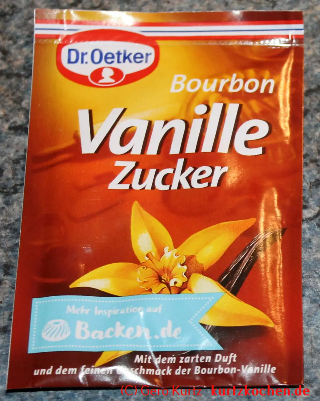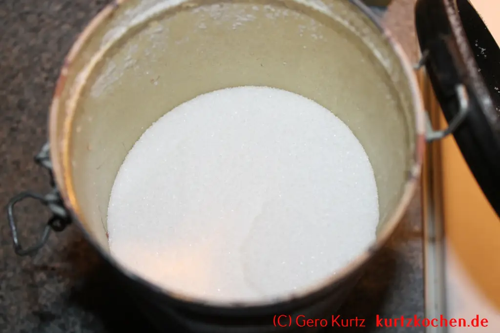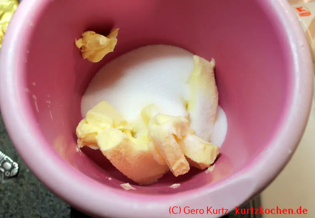 Dann 187 Gramm Butter hineingeben und 125 Gramm Weißzucker. Außerdem ein Päckchen Vanillezucker.