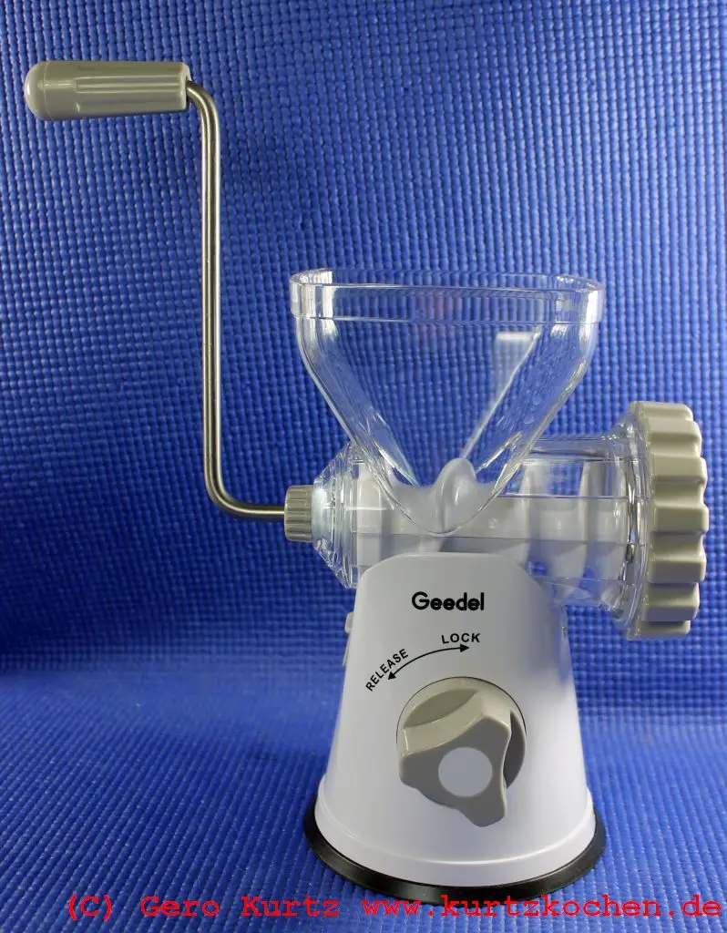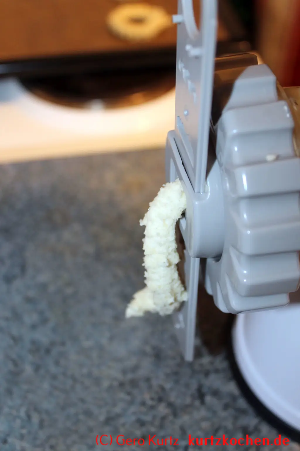 Jetzt den Fleischwolf bzw. die Gebäckpresse befüllen und kräftig drücken und kurbeln.