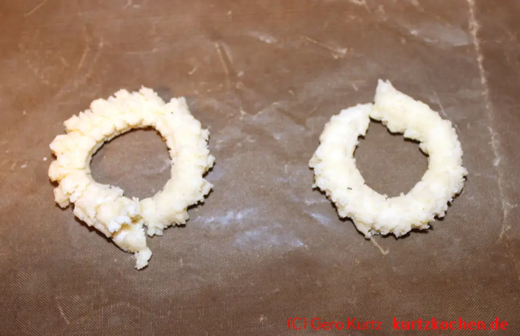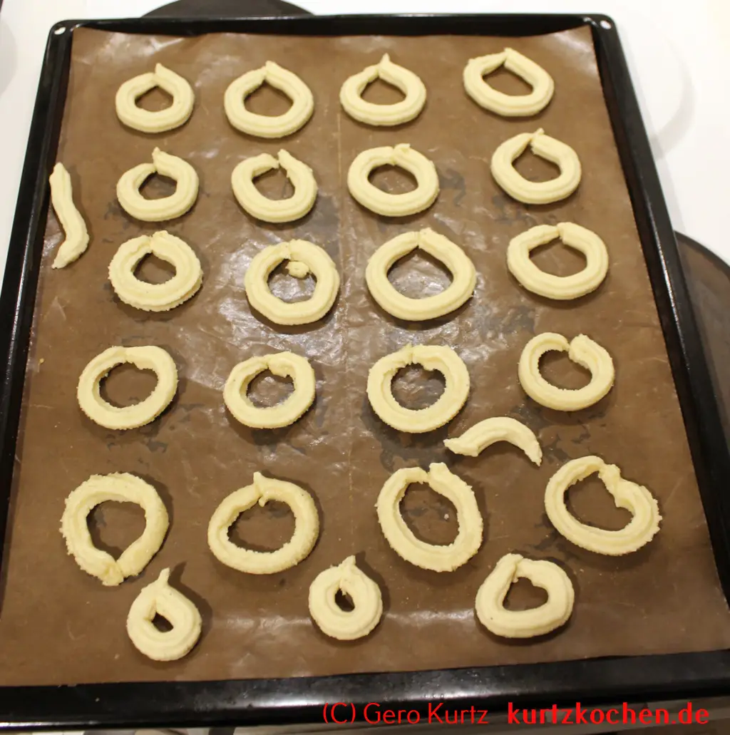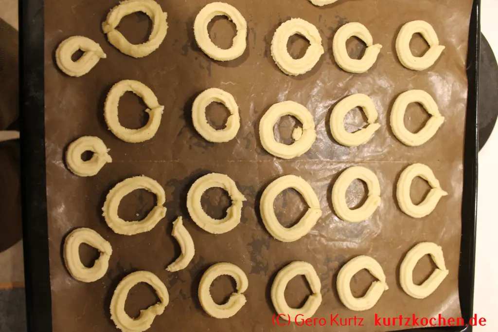 Den herauskommenden Teig zu Kringeln usw. formen und auf ein Backblech legen. Am besten mit Backpapier darunter. In der Zwischenzeit den Backofen auf 180 Grad vorheizen.