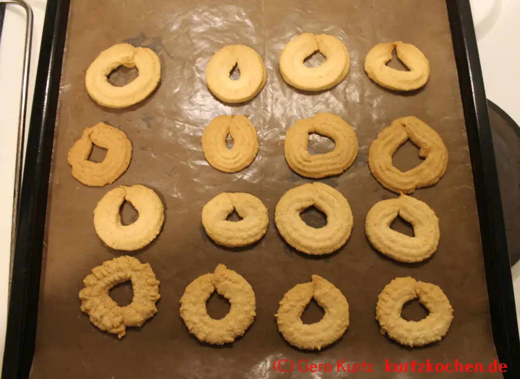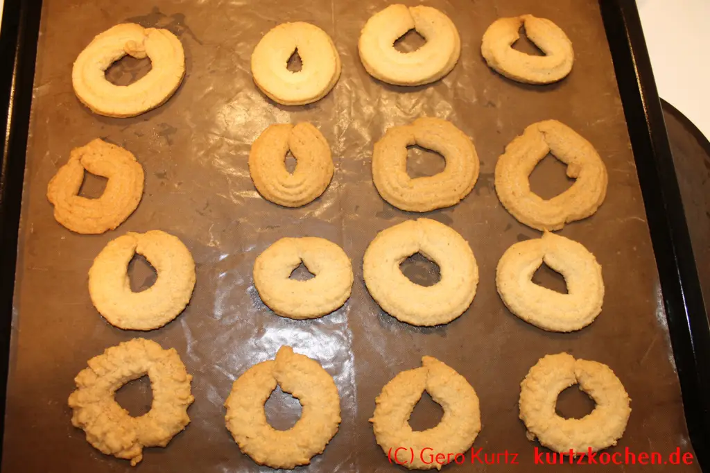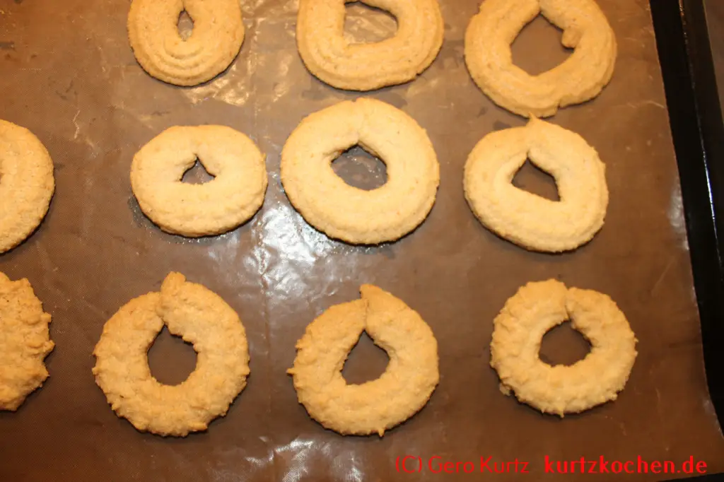 Nun die Kekse bei 180 Grad Ober- und Unterhitze etwa 15 Minuten backen, bis sie leicht gebräunt sind.