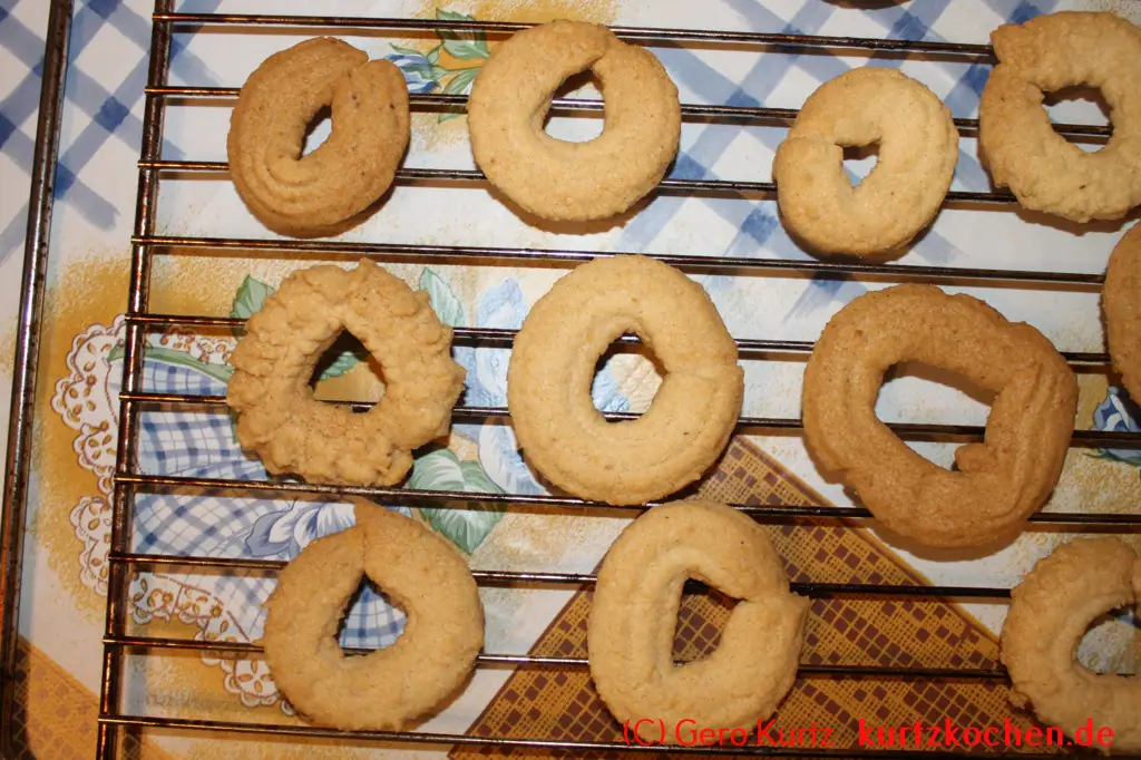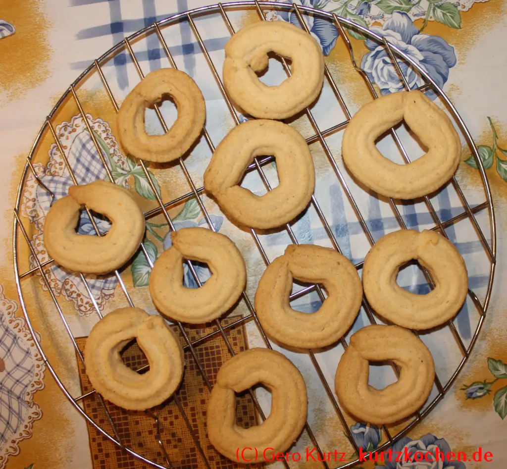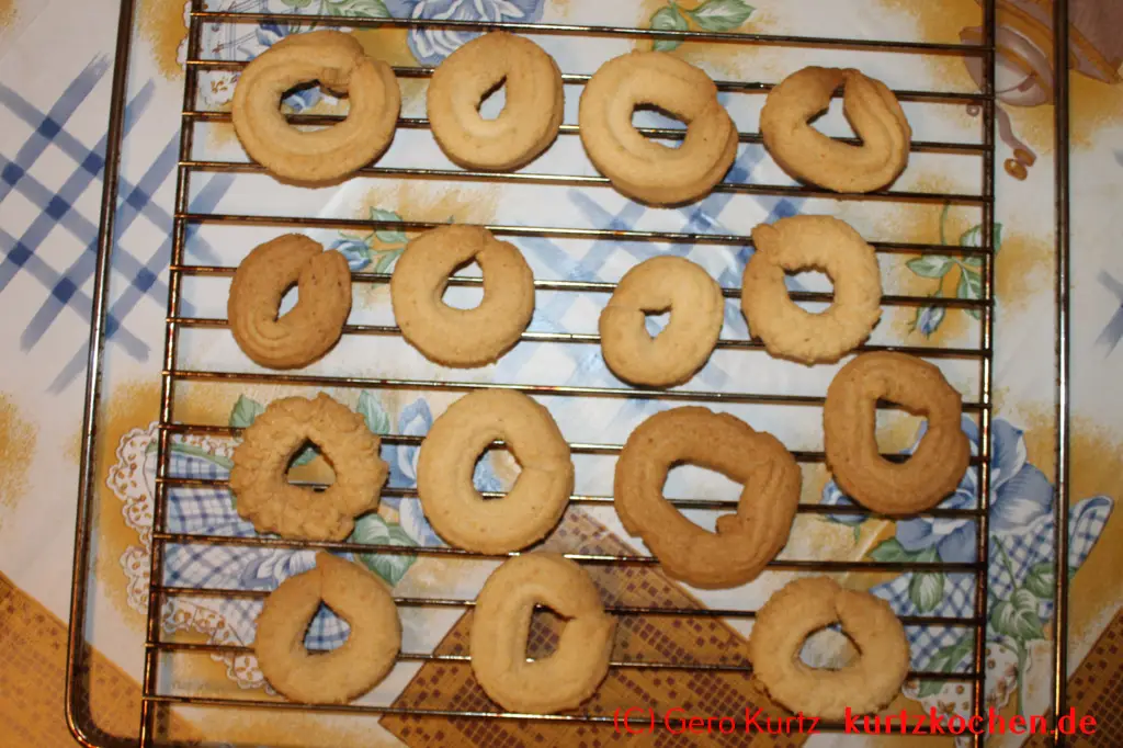 Danach die Butterspritzgebäck-Kekse auf einen Gitterrost legen, damit sie abkühlen können.