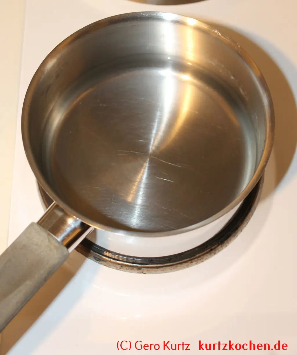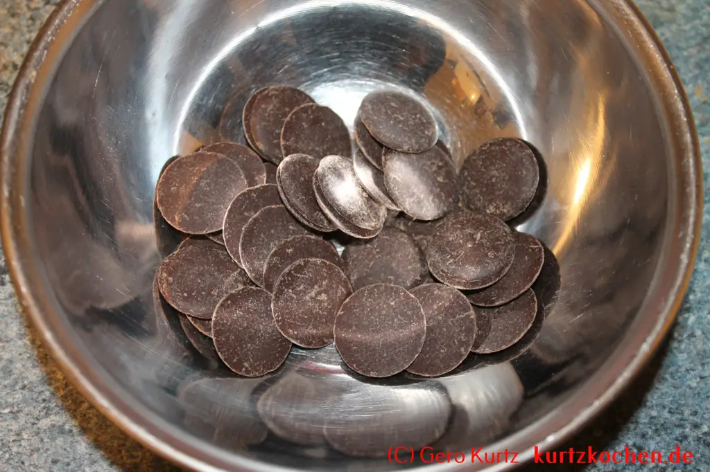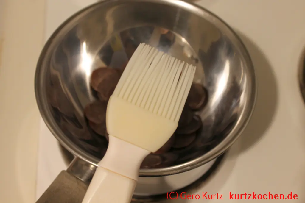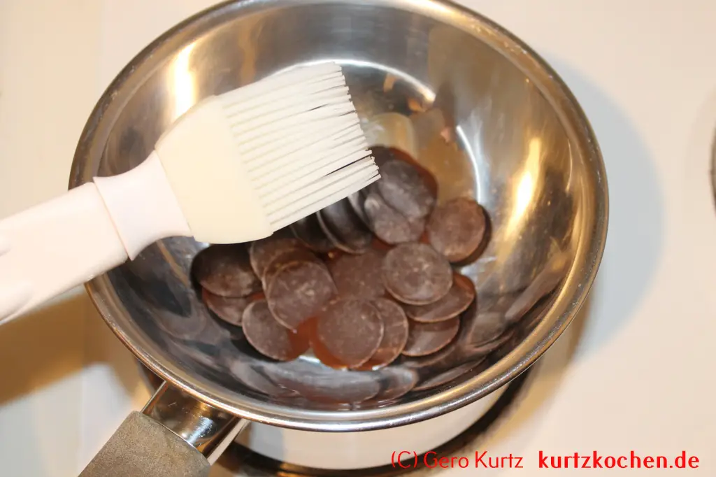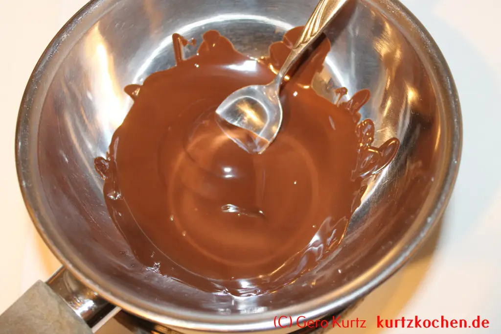 Dann die Schüssel langsam erwärmen, bis die Schokolade schmilzt. Das Schmelzen klappt sehr gut, wenn man die Schüssel über einen mit Wasser befüllten Kochtopf stellt und diesen erwärmt. Wenn Du einen Simmertopf hast, dann natürlich diesen nehmen.