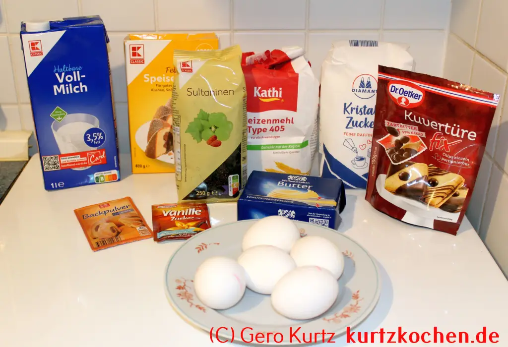 Nach der Fertigstellung des normalen Teiges 2/3 in die Backform füllen. Dann dem restlichen Teig in der Backschüssel 20 Gramm Kakaopulver, zwei gestrichene Esslöffel Zucker und zwei Esslöffel Milch hinzugeben und gut verrühren. Den Schoko-Teig zu dem normalen Teig in die Gugelhupfform geben und mit einer langen Gabel spiralförmig unter den weißen Teig ziehen. Dann normal ausbacken. In der Regel benötigt der Kuchen dann 5 Minuten länger.