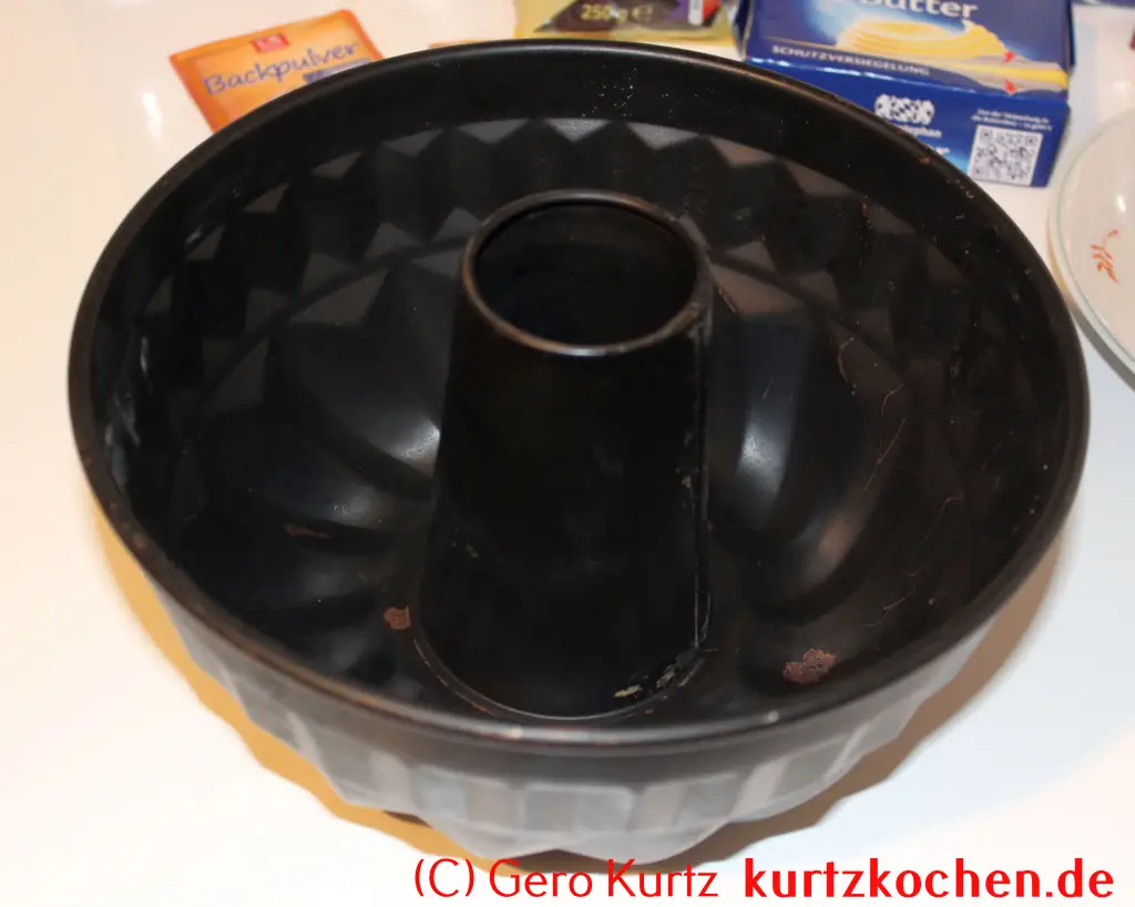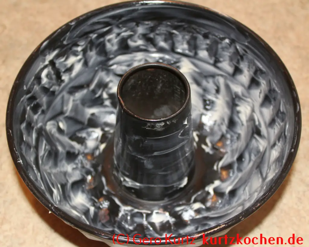Die Gugelhupf Form nehmen und mit etwas Fett mit den Händen gut ausfetten. Dann etwas Mehl hineingeben und über der Spüle nach allen Richtungen bewegen, dass das Mehl überall am Fett haften bleibt und einen gleichmäßigen weißen Belag ergibt. Das überschüssige, nicht haftende Mehl, in die Spüle schütten.