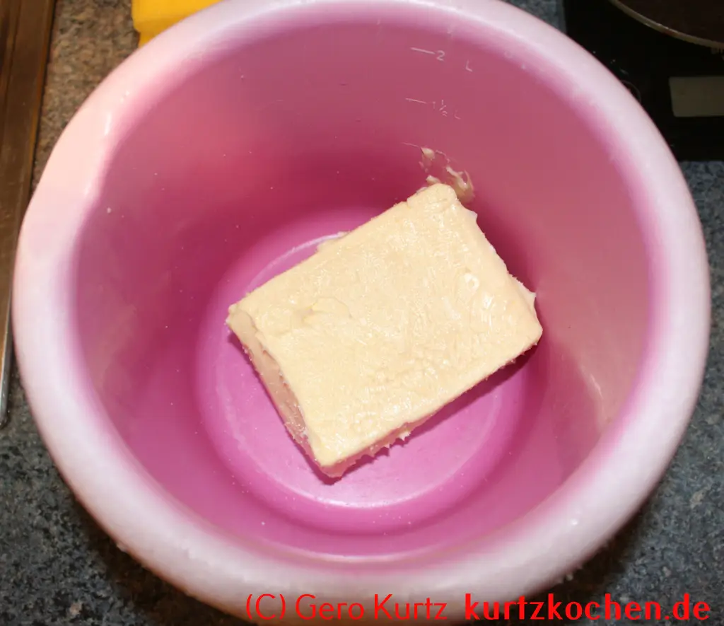 Ich empfehle Dir für den Kuchen auf jeden Fall Butter zu verwenden. Margarine geht zwar auch, schmeckt aber bei Weitem nicht so gut. Butter und die Eier etwa zwei Stunden vorher aus dem Kühlschrank nehmen und in die Küche auf einen Teller legen, damit sie warm werden.