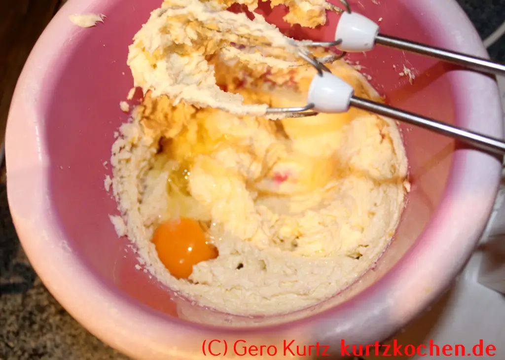 Nun dem schaumigen Butter-Zucker-Gemisch nach und nach die fünf Eier hinzufügen und wieder gut mit dem Mixer (oder der Rührkeule) verrühren.