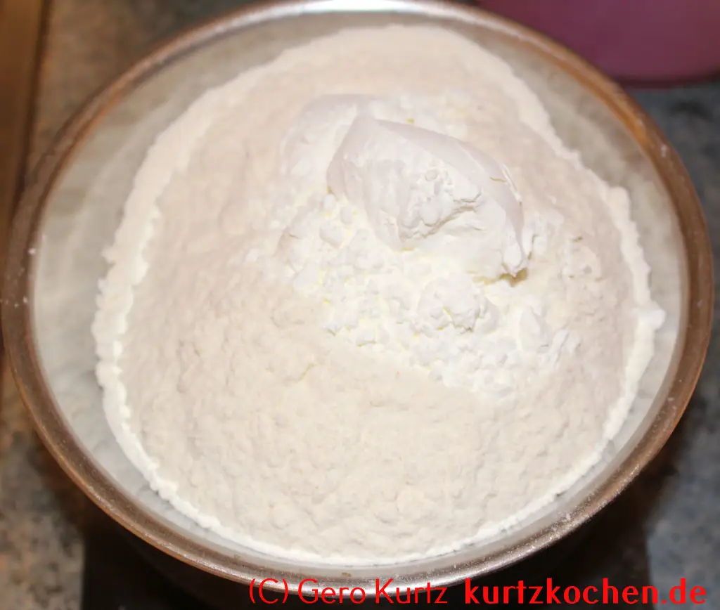 Inzwischen mit der Waage 400 Gramm Mehl in einer separaten Schüssel abmessen. Möchtest Du den Gugelhupf verfeinern, dann miss 350 Gramm Mehl ab und dazu 50 Gramm "Feine Speisestärke".