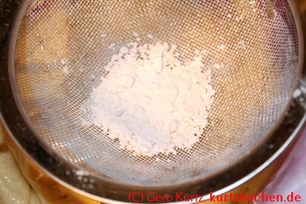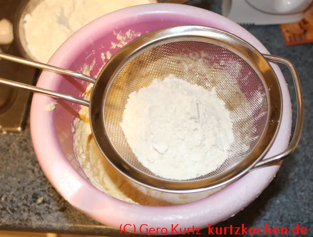 Jetzt ein großes Sieb über die Backform stellen und das Mehl nach und nach durchsieben. Dazwischen immer wieder gut verrühren.