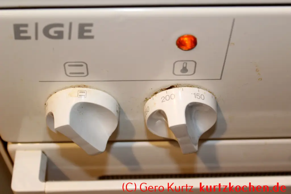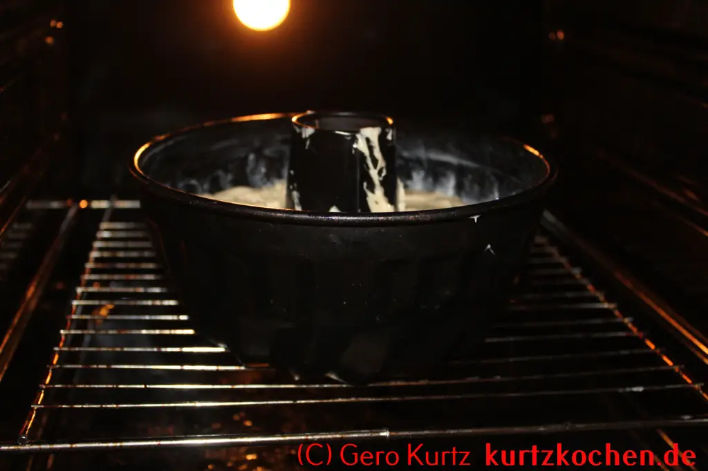 Wenn der Backofen die vorgegebene Temperatur erreicht hat (180 Grad Ober-/Unterhitze bzw. 160 Grad Umluft), die Backform auf das unten eingeschobene Gitter stellen.