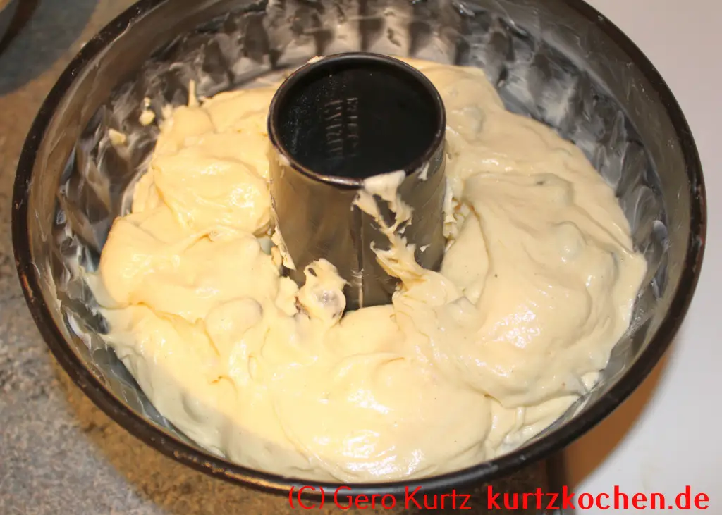 Dann den Teig mit einem Löffel gleichmäßig in der Gugelhupf Form verteilen. Falls der Teig nicht ganz gleichmäßig ist, die Form kräftig rütteln oder klopfen.