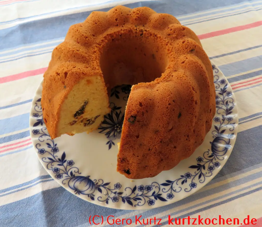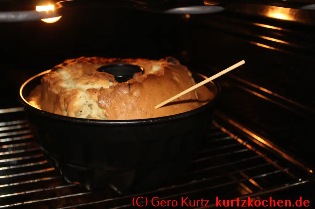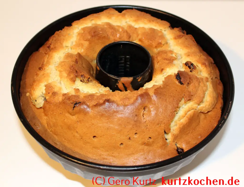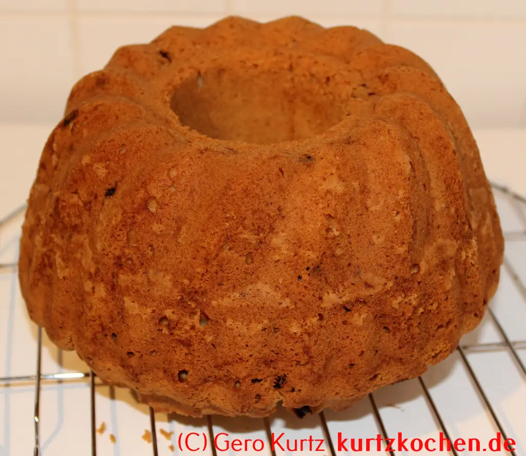 Nach Ablauf der Backzeit ein Holzstäbchen nehmen und den Gartest machen. Den Holzspieß tief in den Kuchen stecken, herausziehen und prüfen, ob noch flüssiger Teig daran klebt. Wenn nicht, dann ist der Kuchen fertig und kann aus dem Backofen herausgeholt werden. Dafür unbedingt Küchenhandschuhe benutzen! 10 Minuten draußen stehen lassen und dann den Kuchen auf ein Gitter stürzen. Dabei die Backform umdrehen und vorsichtig klopfen, bis sich der Kuchen löst.
