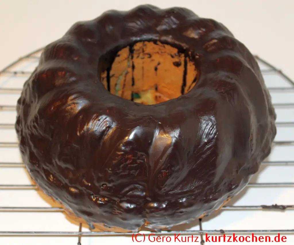 Wenn der Kuchen völlig abgekühlt ist, dann kann er mit einer Schokoladenglasur verziert werden. Dazu die Schokoladenglasur nach Herstellervorschrift erwärmen und mit einem Silikonpinsel*den Kuchen damit ringsherum bestreichen. Danach den Kuchen kalt stellen und die Glasur erhärten lassen.