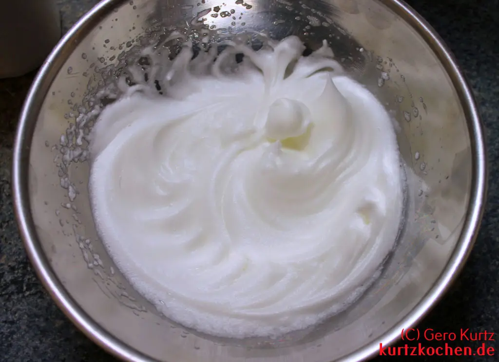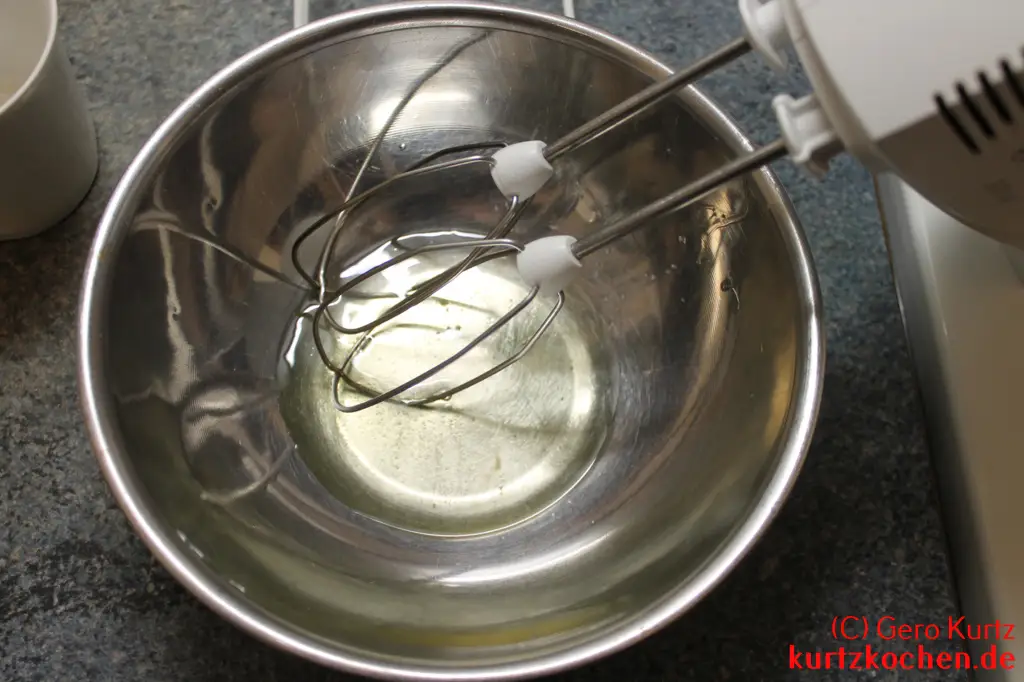 Als Letztes muss nun der Eischnee zubereitet und untergehoben werden. Dazu das Eiweiß und eine Prise Salz in eine Schüssel geben. Das Eiweiß mit dem Schneebesen oder den vorher gereinigten Mixerstäben zu einem festen weißen Schaum schlagen. Danach diesen zu dem Teig geben und mit den Knethaken unterrühren.