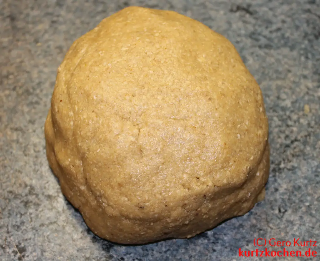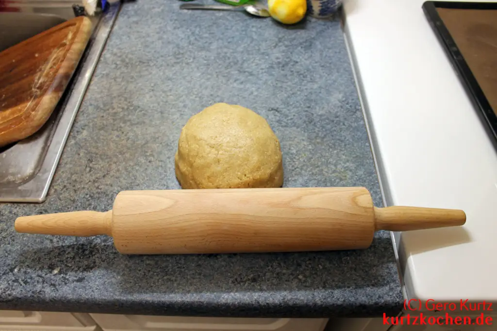 Nun den Teig herausheben und mit dem Nudelholz dünn ausrollen (ca. 5 mm Höhe). Falls kein Nudelholz da ist, geht es zur Not auch mit einer Flasche oder auch mit den, vorher gewaschenen, Händen.