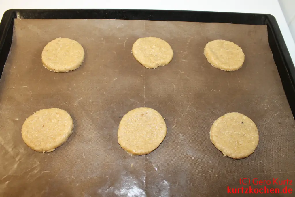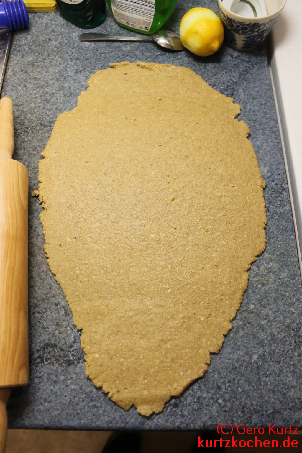 Hinweis: Wenn der Teig stark klebt, dann ihn am besten ein paar Stunden in den Kühlschrank stellen. Dann lässt er sich besser ausrollen. Ansonsten die Ausrollfläche mit Mehl bestäuben. Wenn dies auch nicht hilft, einfach mit der gemehlten Hand kleine Bälle formen und diese dann auf dem Backpapier plattdrücken. Bewährt hat sich bei mir auch die glatte Seite vom Fleischklopfer. Diese in Mehl tauchen und dann die geformten Teigbälle, die schon auf dem Backpapier liegen, auf die gewünschte Dicke herunterklopfen.