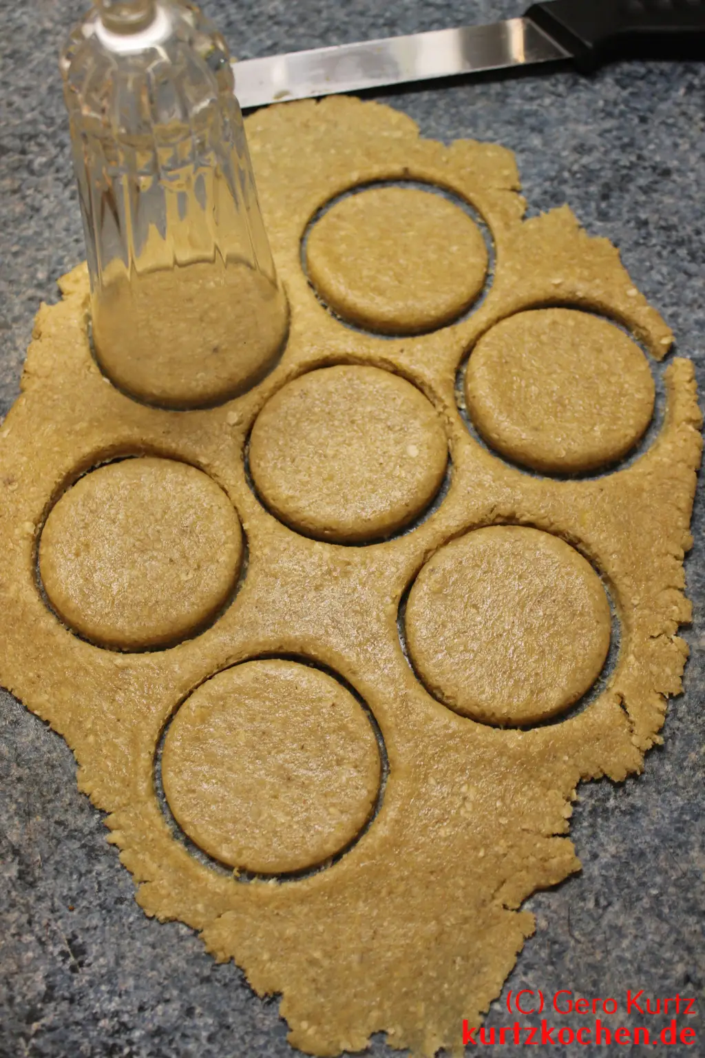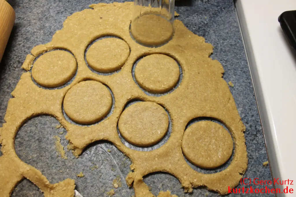 Ist der Teig entsprechend ausgerollt, dann runde Keksformen (oder auch Figuren) ausstechen. Normalerweise gibt es dafür spezielle Ausstecher. Falls diese aber nicht vorhanden sind, dann tut es auch ein umgedrehtes Sektglas, oder Ähnliches.