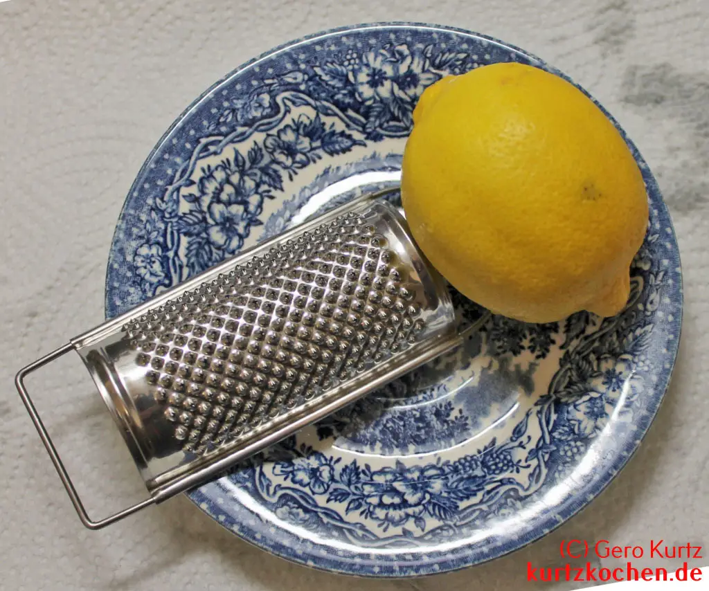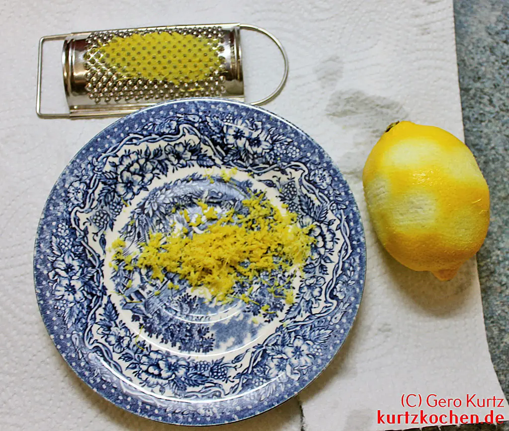 Zuerst am besten ein wenig Zitronenschale reiben. Am geeignetsten ist dafür eine unbehandelte Bio-Zitrone. Diese gut abwaschen. Falls sie nur gespritzte und gewachste haben, diese unbedingt sehr heiß waschen, damit sich die Wachsschicht von der Schale löst. Dann mit der Reibe etwas Zitronenschale reiben und auf einem Unterteller zur späteren Verwendung hinstellen.