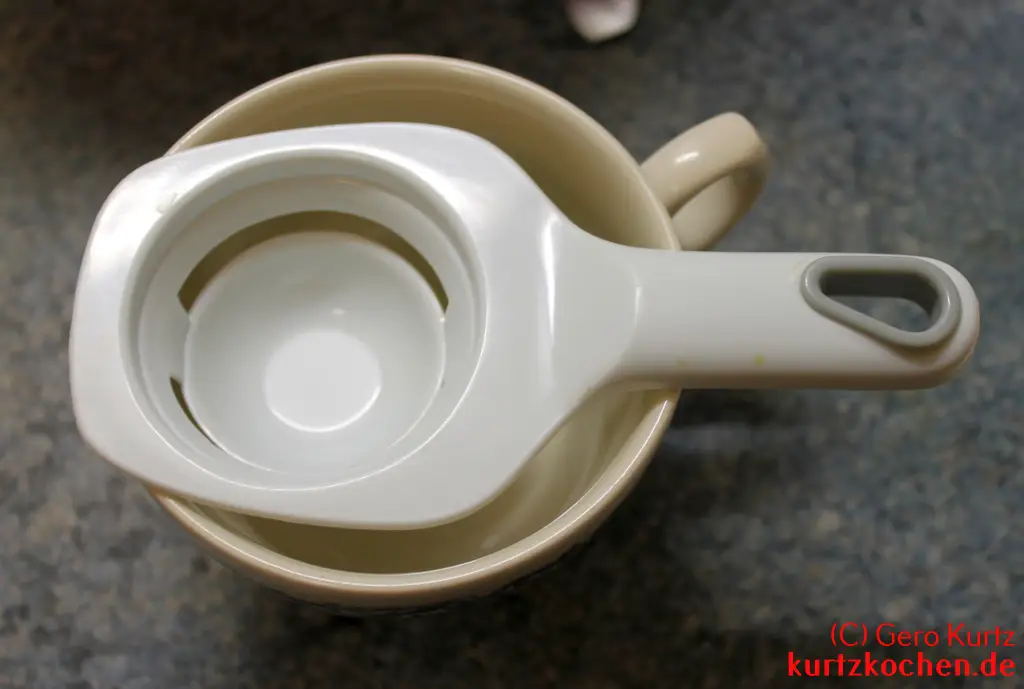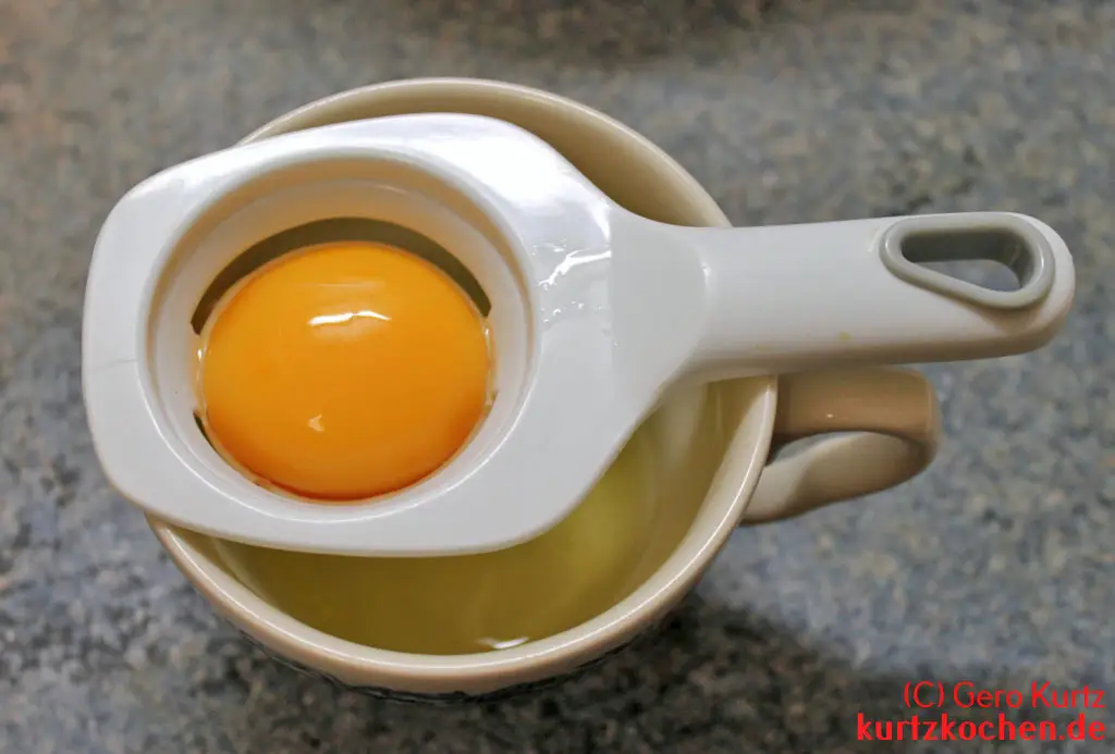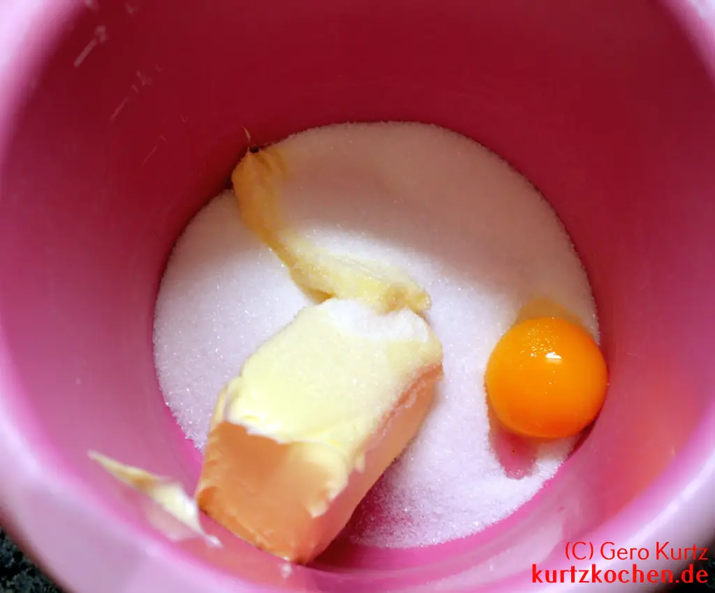 Nun nehmen wir eine Schüssel und stellen diese auf die Küchenwaage. In die Schüssel kommen der Zucker und die Butter. Das eine Ei müssen wir in Eigelb und Eiweiß trennen. Dies kann man per Hand machen, indem man das Ei aufschlägt und über einer Tasse so lange zwischen den Eierschalen hin und her schüttet, bis das Eiweiß in der Tasse ist. Dabei muss man aufpassen, dass das Eigelb nicht kaputtgeht. Leichter geht es mit einem Eitrenner. Das getrennte Eigelb dann ebenfalls in die Schüssel zur Butter und dem Zucker geben.