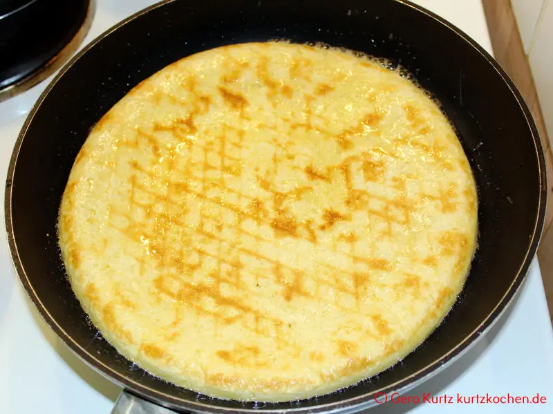 Hinweis: Ist der Teig dünn genug, verläuft er in der Regel in der Pfanne von selbst. Eventuell die Pfanne beim Einfüllen leicht schwenken. - Bei mittlerer Hitze braten, bis die Unterseite goldbraun ist.
