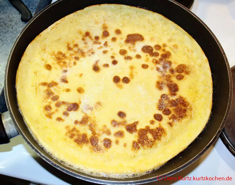 Das mit dem Wenden ist gar nicht so einfach. Erst mal vorsichtig mit einem Pfannenwender nachsehen, ob die Unterseite bereits braun ist und die notwendige Festigkeit aufweist. Dann den Pfannenwender unter den Eierkuchen schieben und diesen mit einem Schwung wenden. Die Methode, den Pfannkuchen mit der Pfanne in die Luft zu werfen, würde ich nicht empfehlen, da das heiße Fett sonst durch die ganze Küche spritzt. - Den Eierkuchen aus der Pfanne nehmen und warm servieren. Optional kannst Du den Eierkuchen mit Zutaten Deiner Wahl belegen, wie Käse, Schinken, Gemüse.