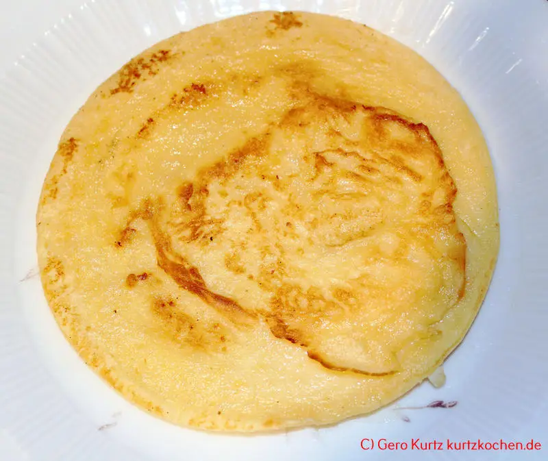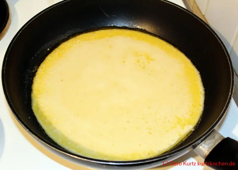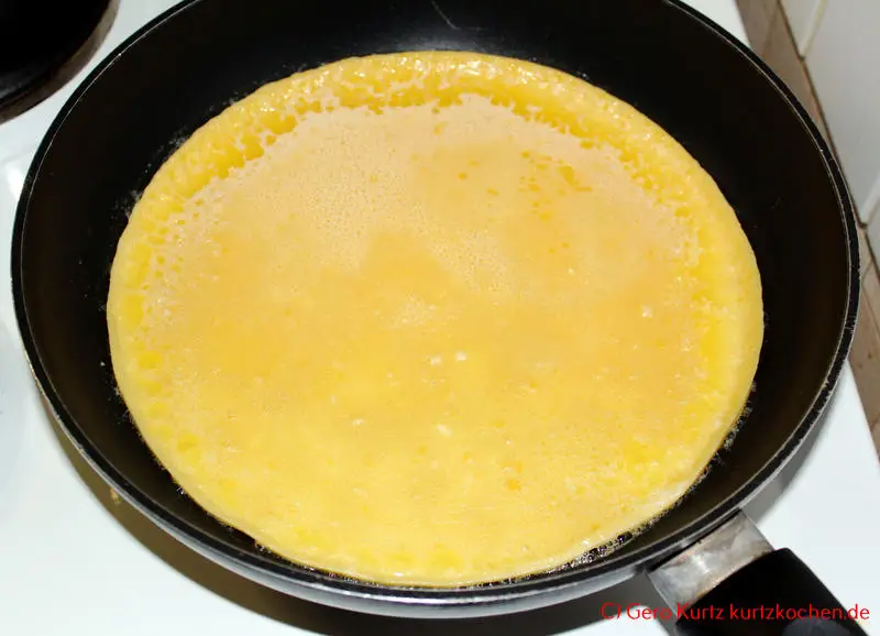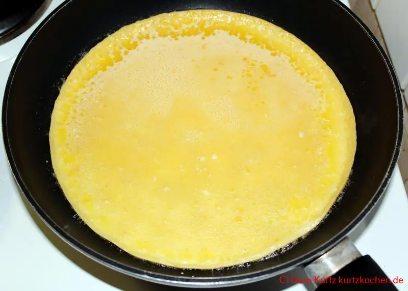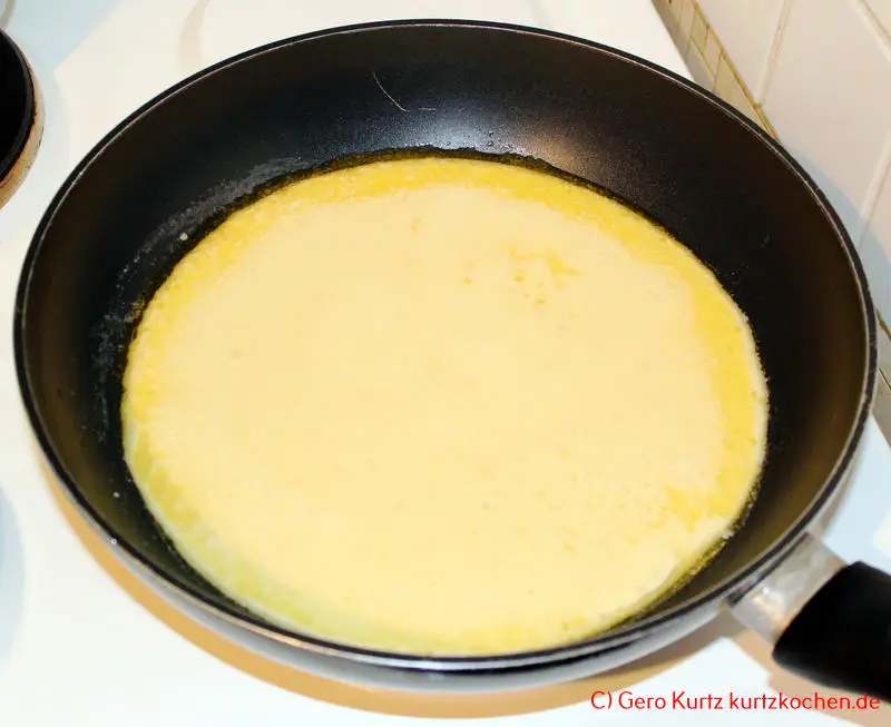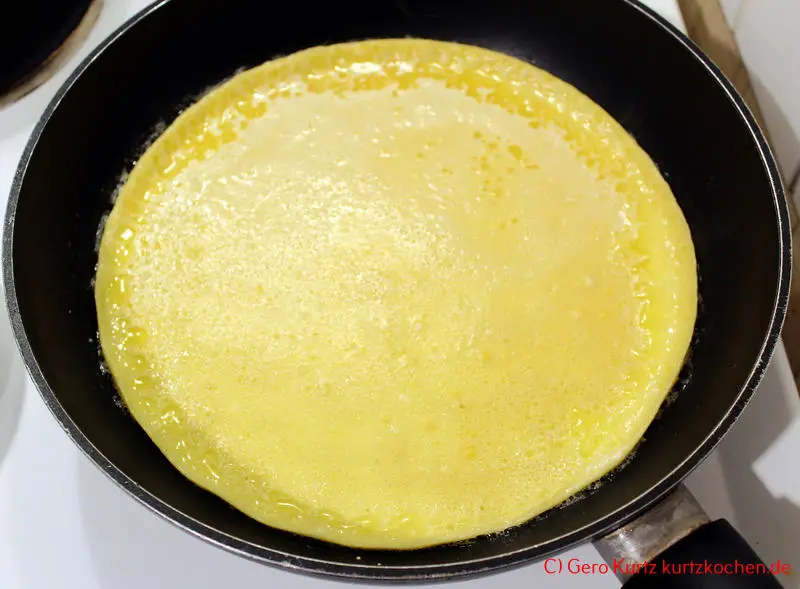 Hinweis: Du kannst die Dicke des Eierkuchens selbst bestimmen. Ich mag ihn ruhig etwas dicker und saftiger. Da benötigt er natürlich etwas länger und eventuell ist es ratsam einen Deckel für einige Zeit aufzulegen. Ansonsten kann es sein, dass die Oberseite flüssig bleibt und es beim Wenden eine Sauerei gibt.
