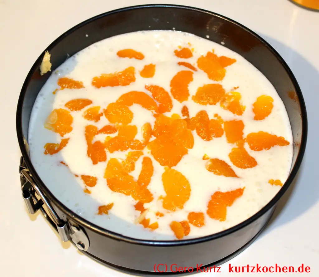 Danach die Mandarinen auf dem Kuchen verteilen, sodass die Oberfläche gleichmäßig bedeckt ist.