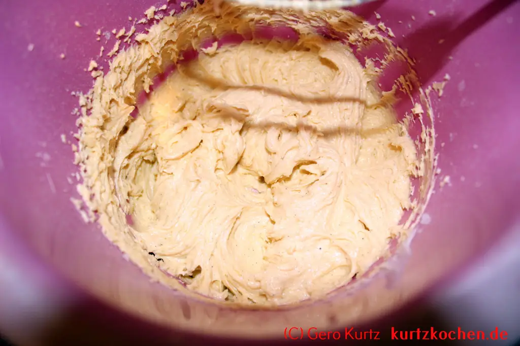 Nun eine weitere Rührschüssel (oder die alte abwaschen) nehmen und die Füllung zubereiten. Dazu den Schmand, den Zucker, und den Vanillezucker mit dem Rührbesen einige Minuten lang gut zu einer einheitlichen Masse verrühren.
